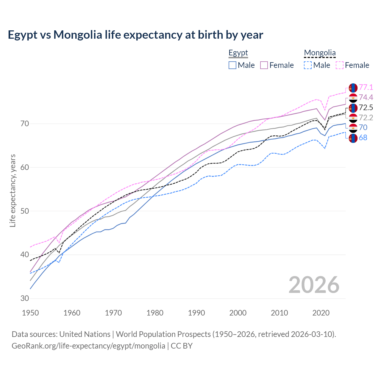 The average life expectancy at birth is 72.2 years in Egypt vs 72.5 in Mongolia. Egypt is ranked 122/197 by life expectancy, and Mongolia is 120/197. In Egypt, the life expectancy is 70 years for males and 74.4 years for females. In Mongolia, it's 68 years for males and 77.1 years for females.