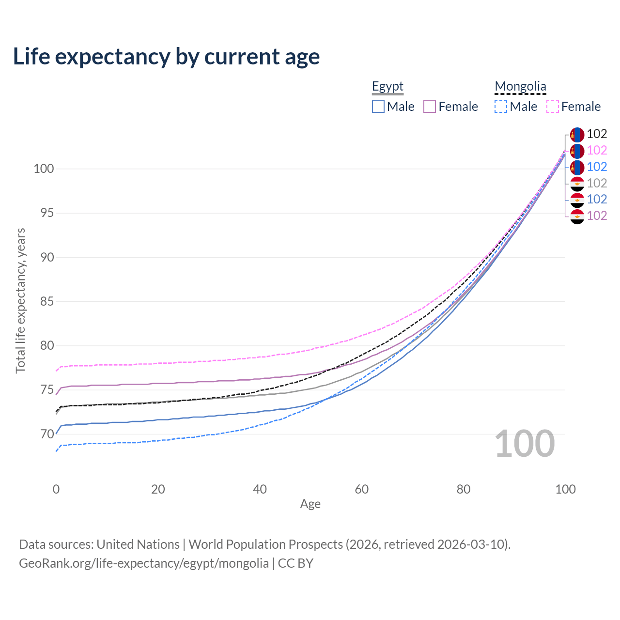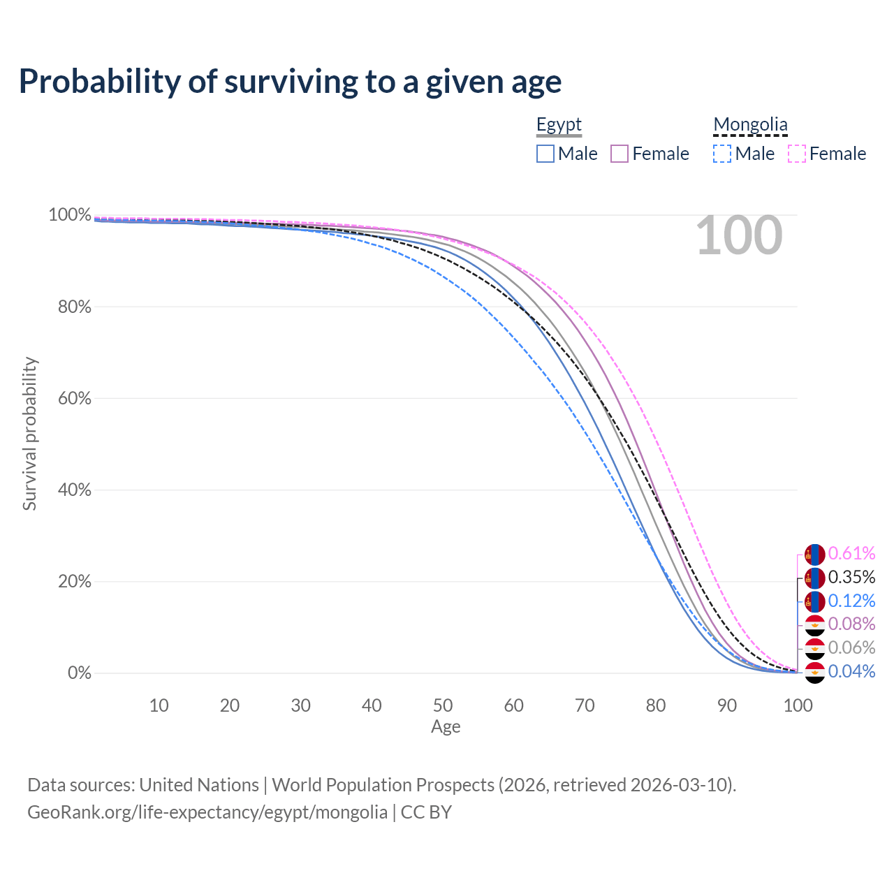 This life expectancy calculator shows the odds of living to 100, 95, 90, and below based on current age for both males and females in Egypt and Mongolia, along with mean and median age of death. The calculations are based on the 2026 life tables (actuarial tables) from the UN World Population Prospects.