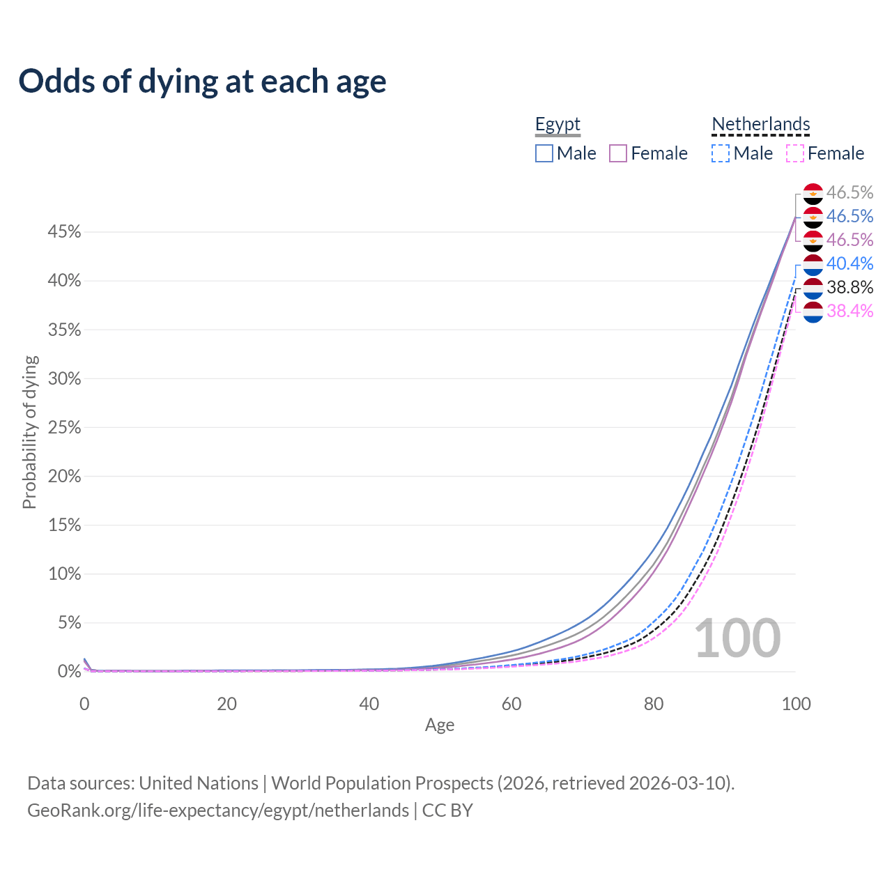 This life expectancy calculator shows the odds of living to 100, 95, 90, and below based on current age for both males and females in Egypt and the Netherlands, along with mean and median age of death. The calculations are based on the 2026 life tables (actuarial tables) from the UN World Population Prospects.