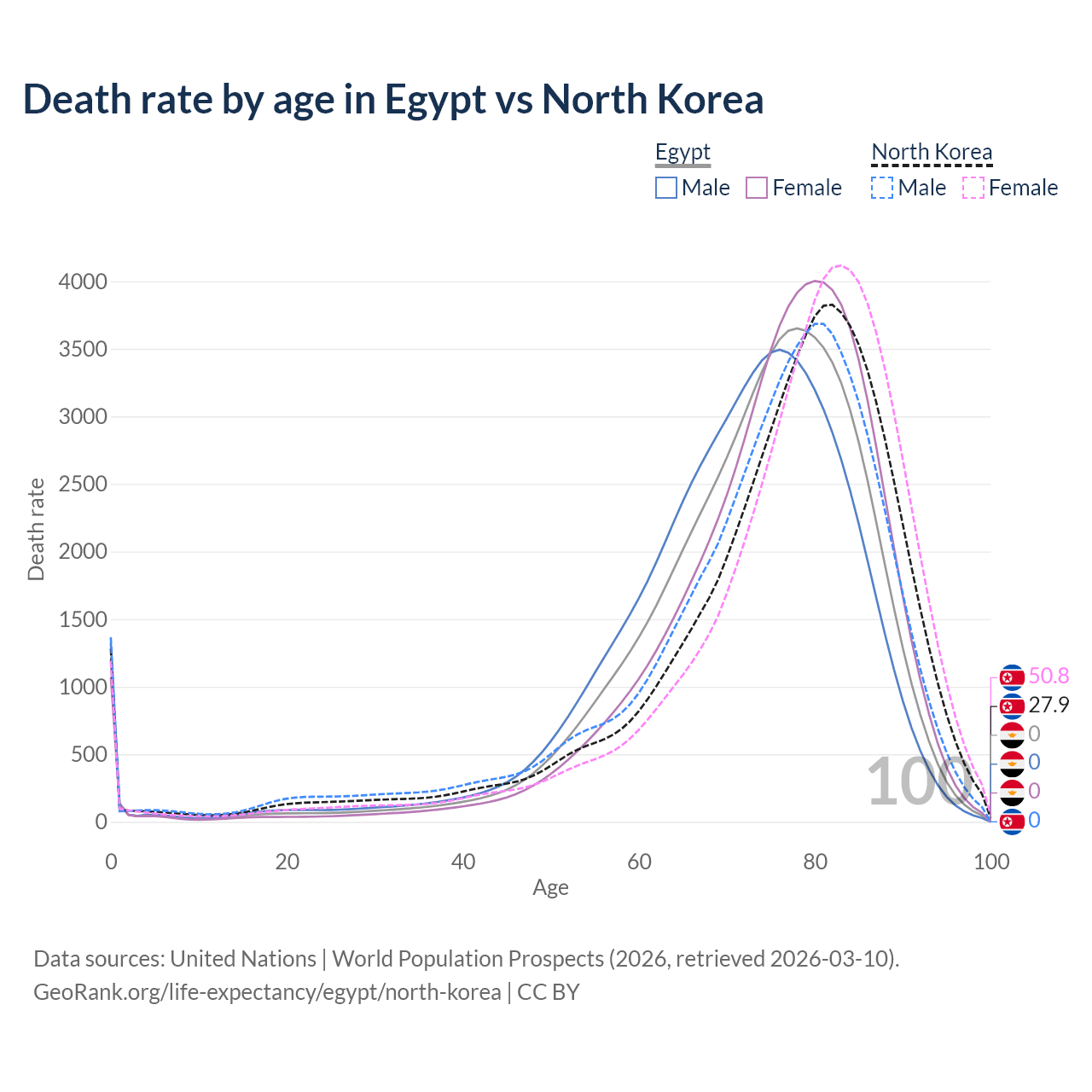 In Egypt, the most common age of death is 78, compared to 82 in North Korea. The median age of death is 75.2 in Egypt and 78.5 in North Korea, meaning only half of each cohort is expected to live past that age.