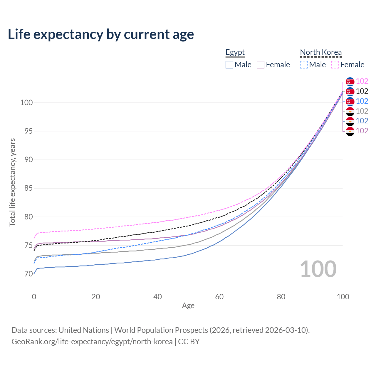 This life expectancy calculator shows the odds of living to 100, 95, 90, and below based on current age for both males and females in Egypt and North Korea, along with mean and median age of death. The calculations are based on the 2026 life tables (actuarial tables) from the UN World Population Prospects.