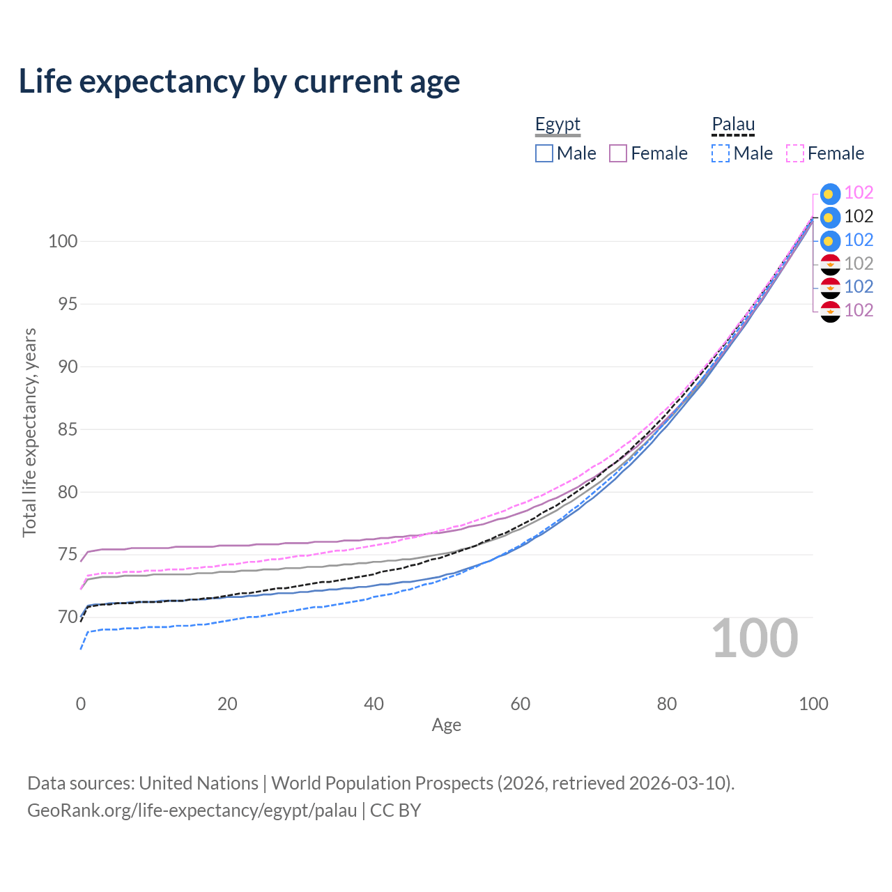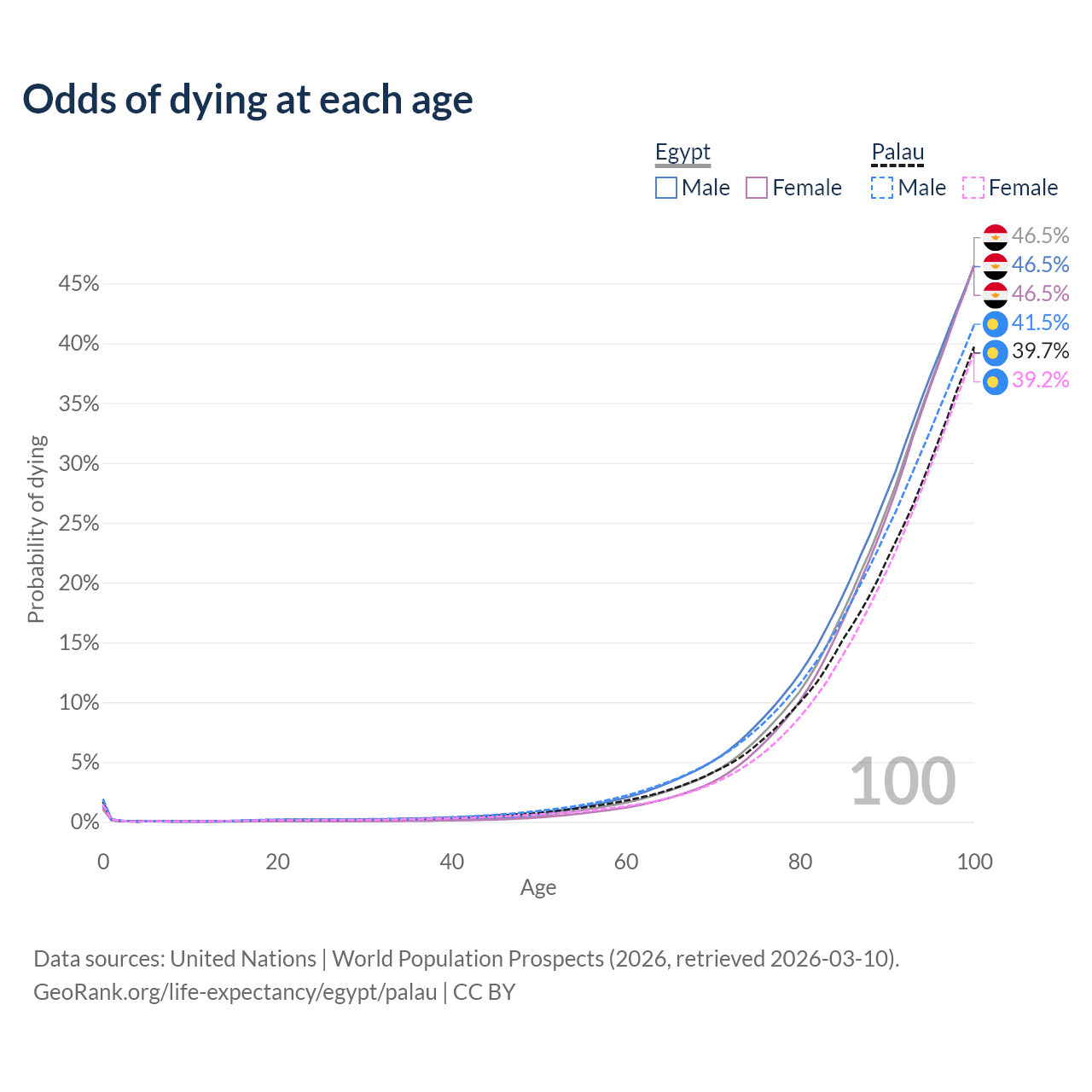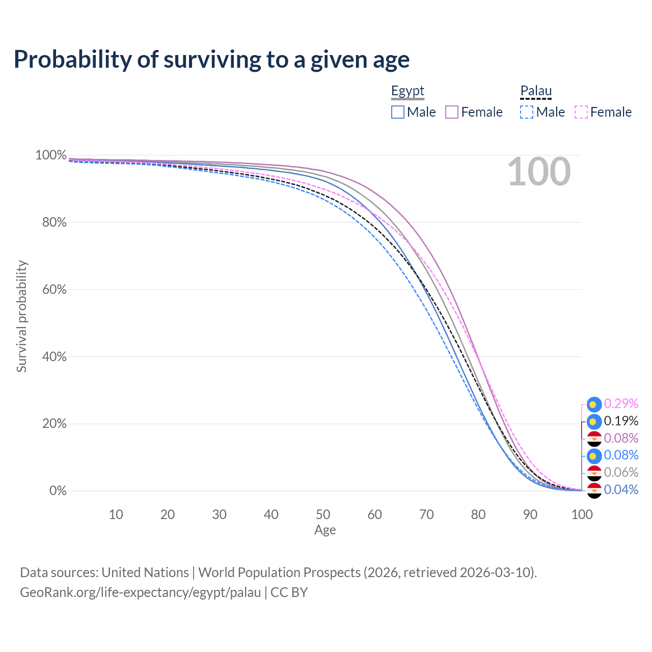 This life expectancy calculator shows the odds of living to 100, 95, 90, and below based on current age for both males and females in Egypt and Palau, along with mean and median age of death. The calculations are based on the 2026 life tables (actuarial tables) from the UN World Population Prospects.