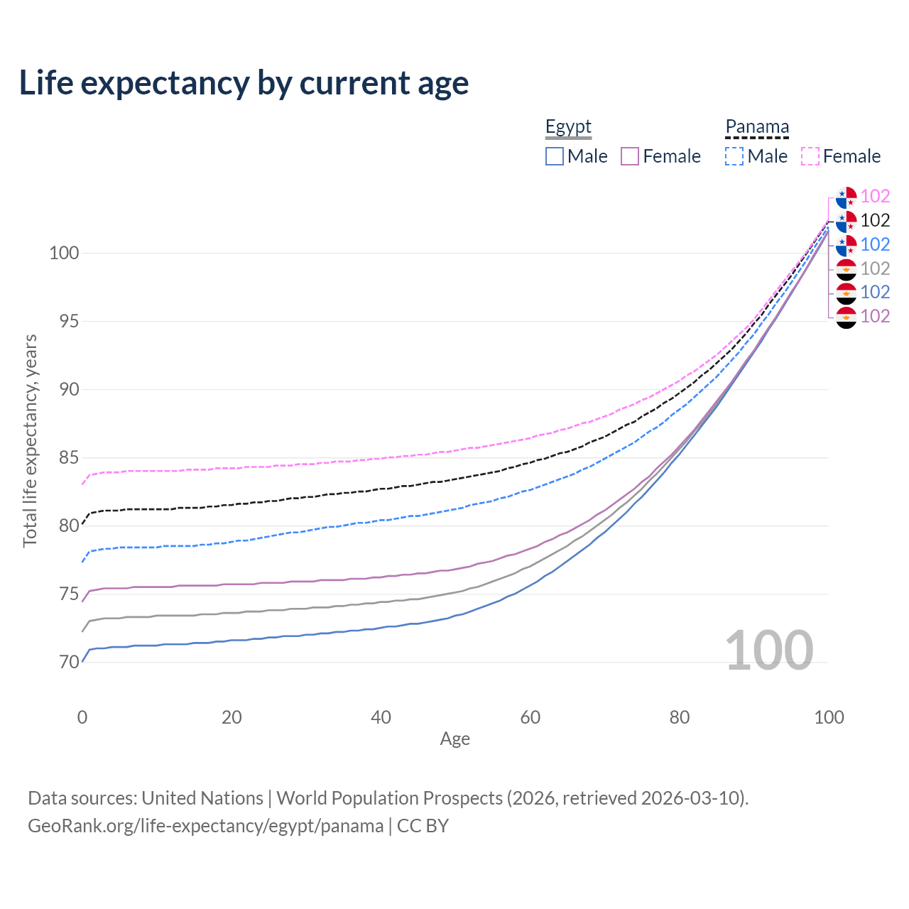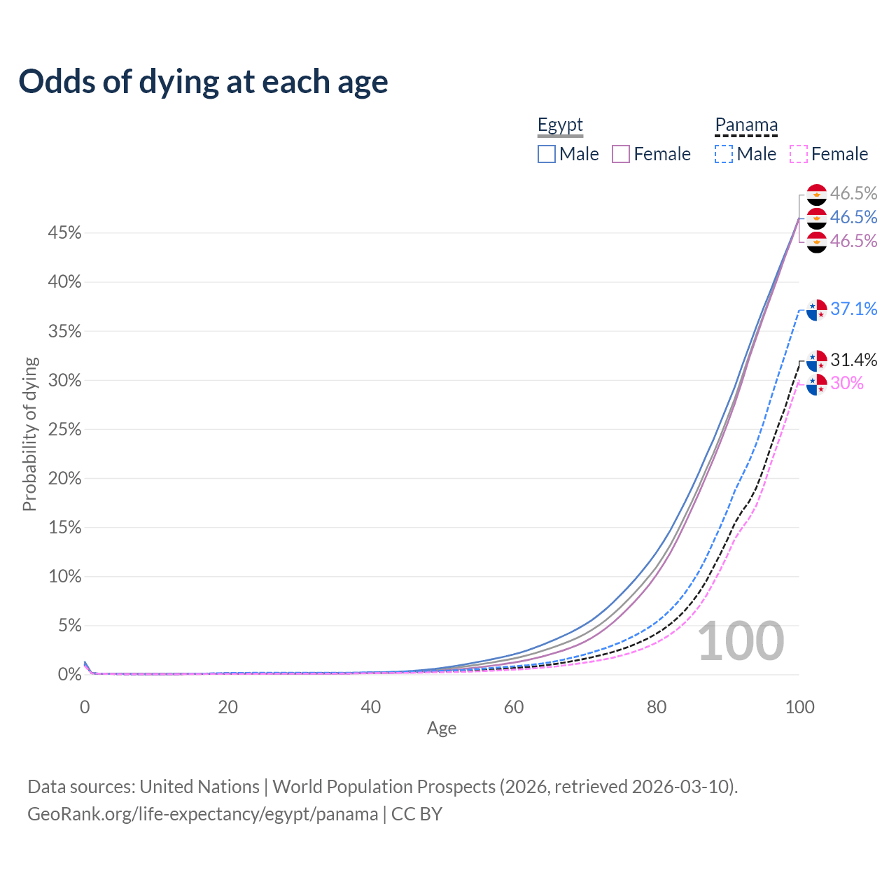 This life expectancy calculator shows the odds of living to 100, 95, 90, and below based on current age for both males and females in Egypt and Panama, along with mean and median age of death. The calculations are based on the 2026 life tables (actuarial tables) from the UN World Population Prospects.