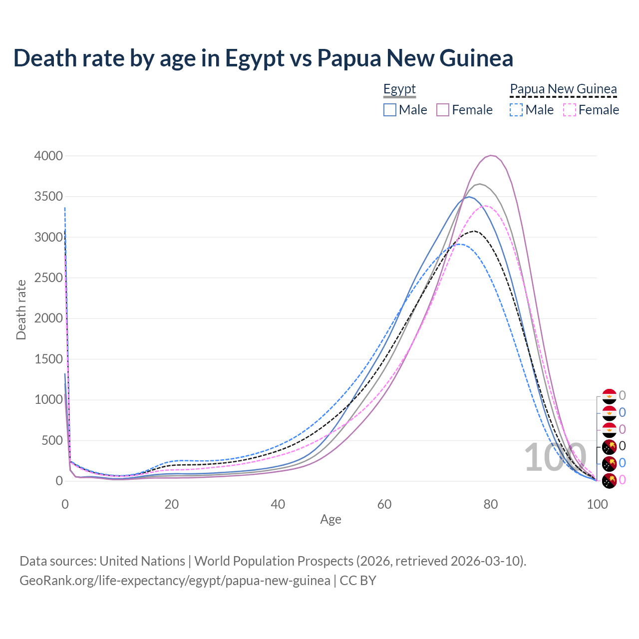In Egypt, the most common age of death is 78, compared to 0 in Papua New Guinea. The median age of death is 75.2 in Egypt and 71.7 in Papua New Guinea, meaning only half of each cohort is expected to live past that age.