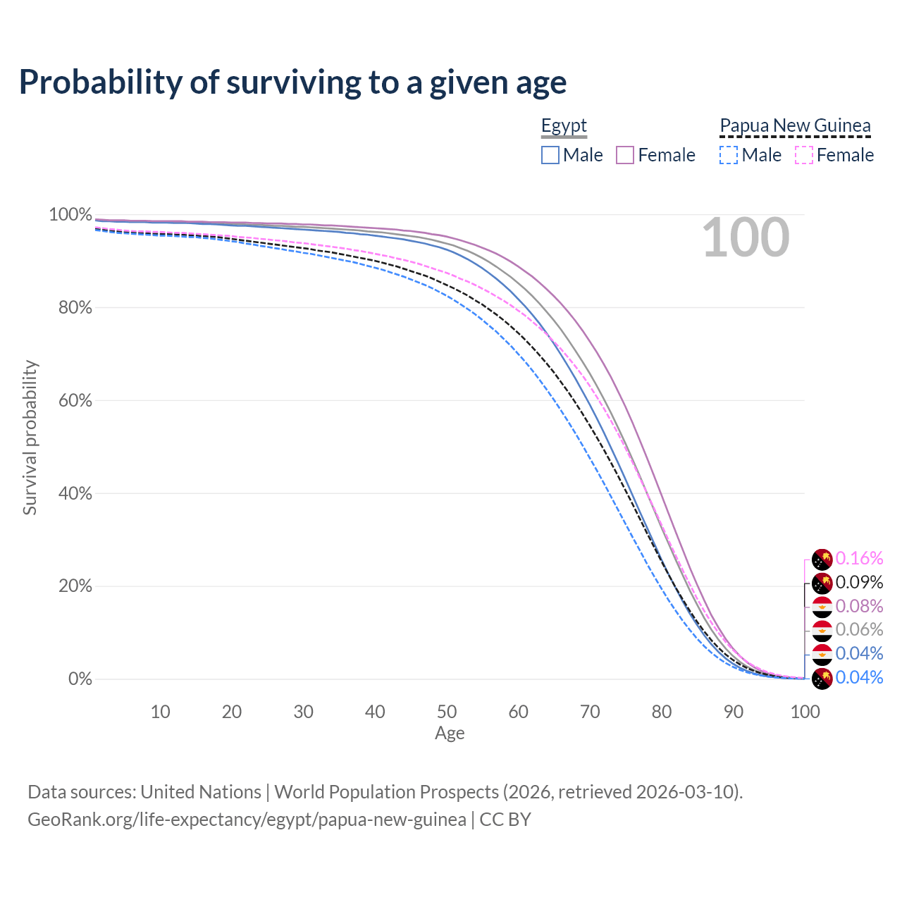This life expectancy calculator shows the odds of living to 100, 95, 90, and below based on current age for both males and females in Egypt and Papua New Guinea, along with mean and median age of death. The calculations are based on the 2026 life tables (actuarial tables) from the UN World Population Prospects.
