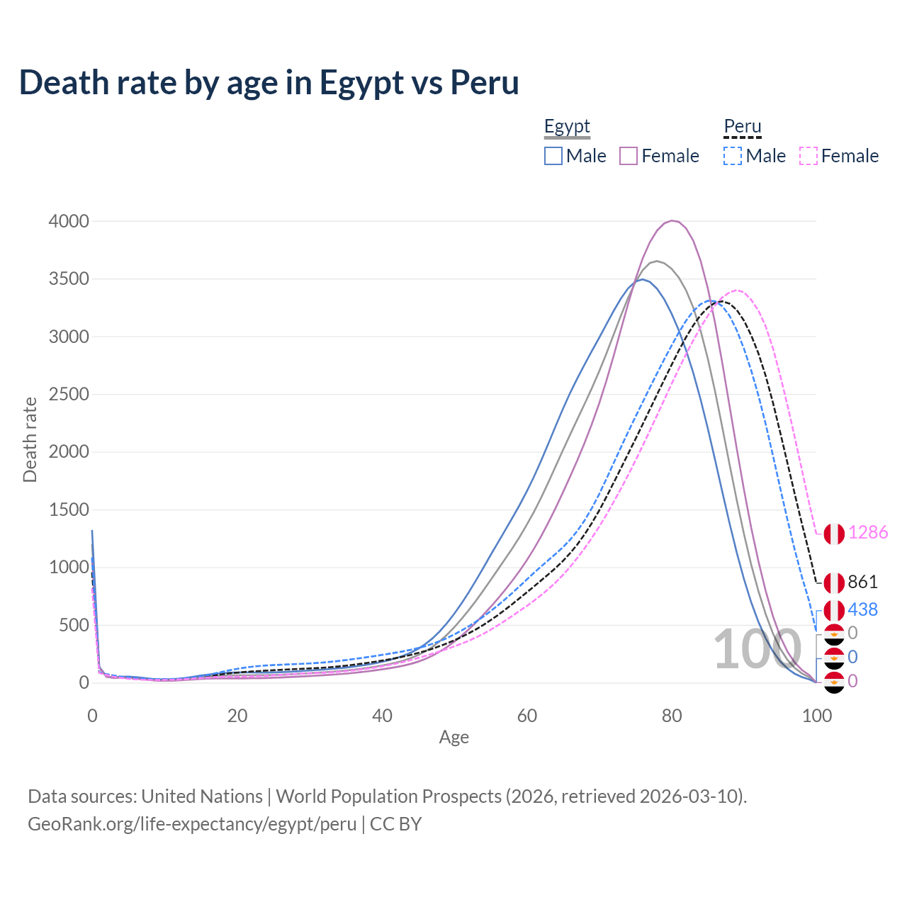 In Egypt, the most common age of death is 78, compared to 87 in Peru. The median age of death is 75.2 in Egypt and 82.4 in Peru, meaning only half of each cohort is expected to live past that age.