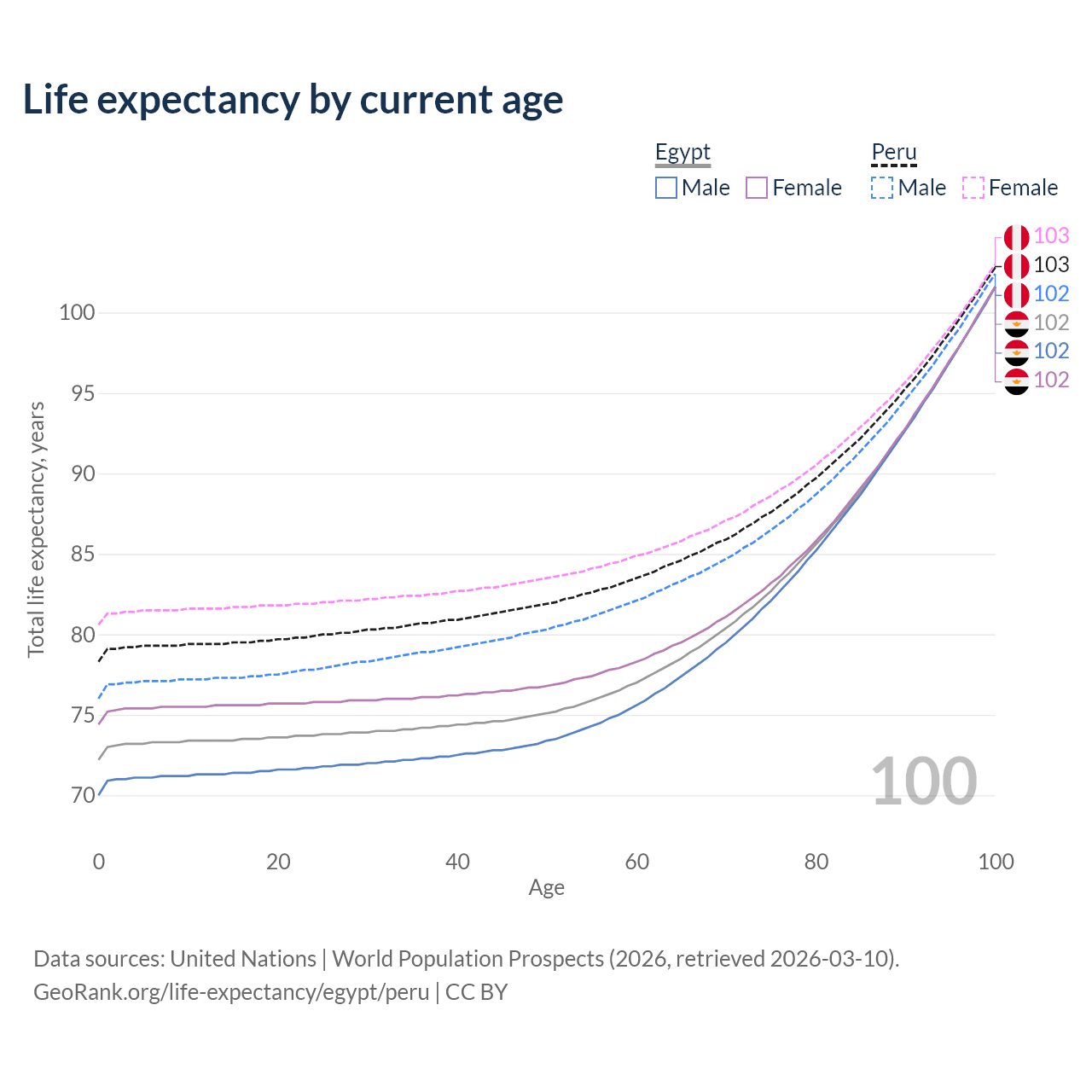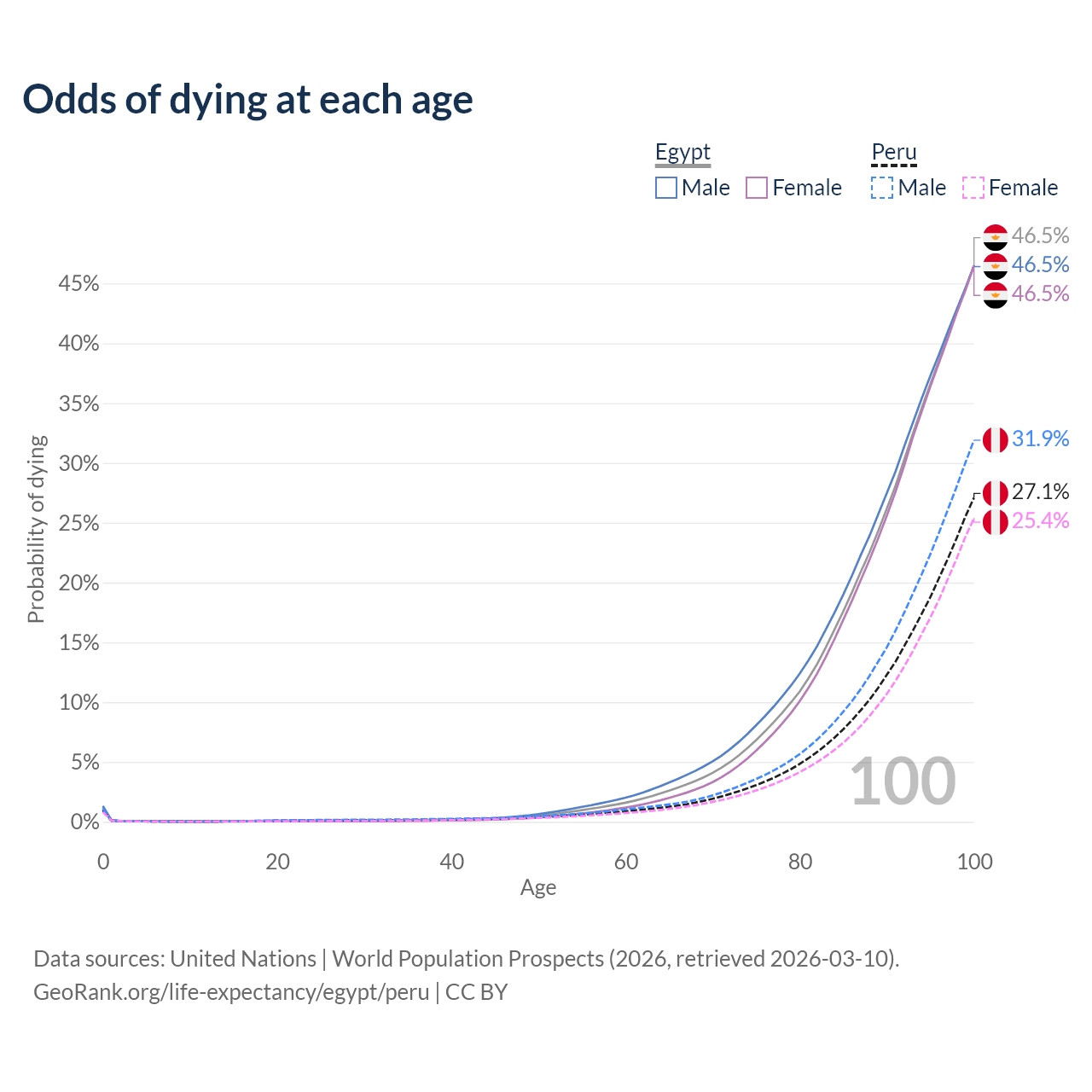 This life expectancy calculator shows the odds of living to 100, 95, 90, and below based on current age for both males and females in Egypt and Peru, along with mean and median age of death. The calculations are based on the 2026 life tables (actuarial tables) from the UN World Population Prospects.
