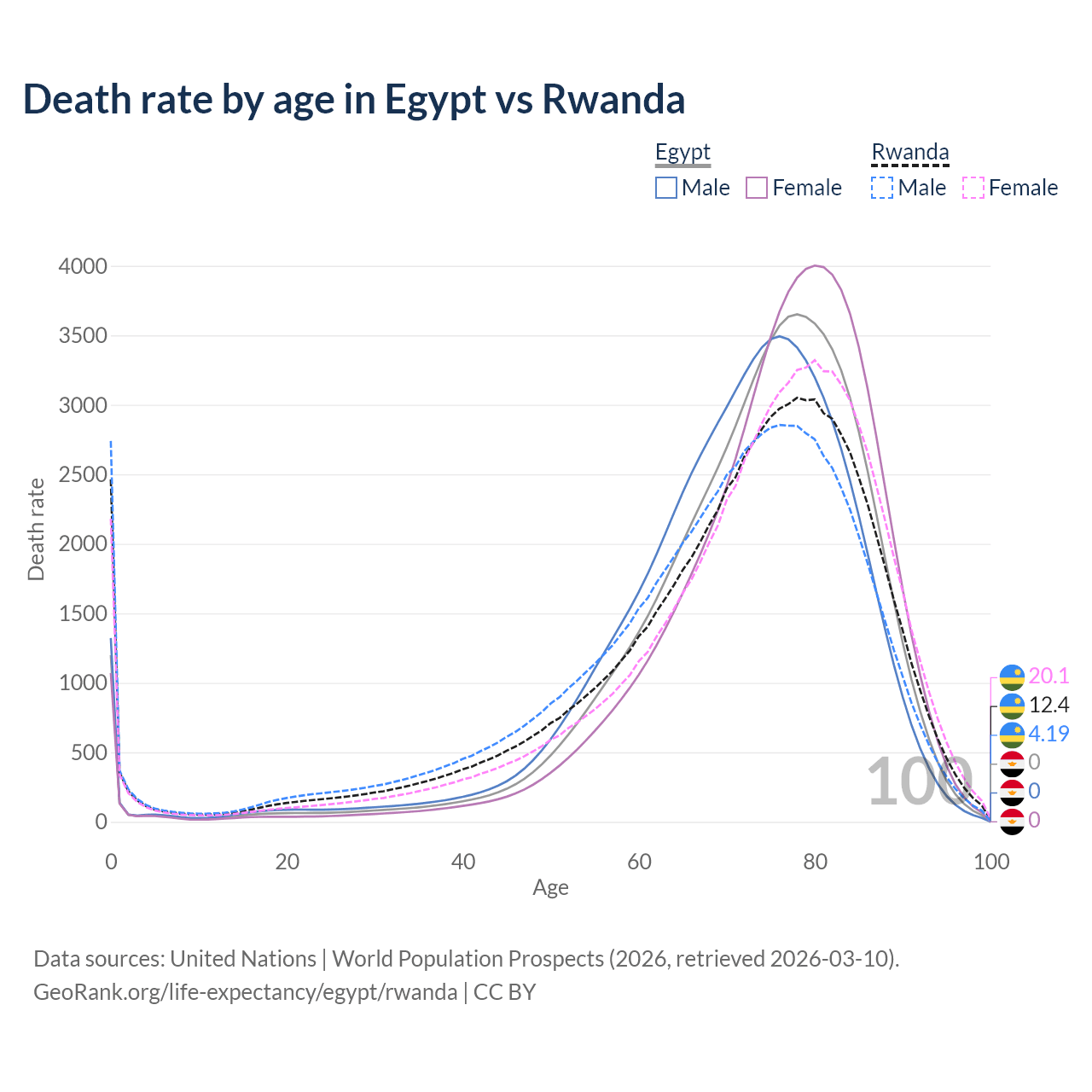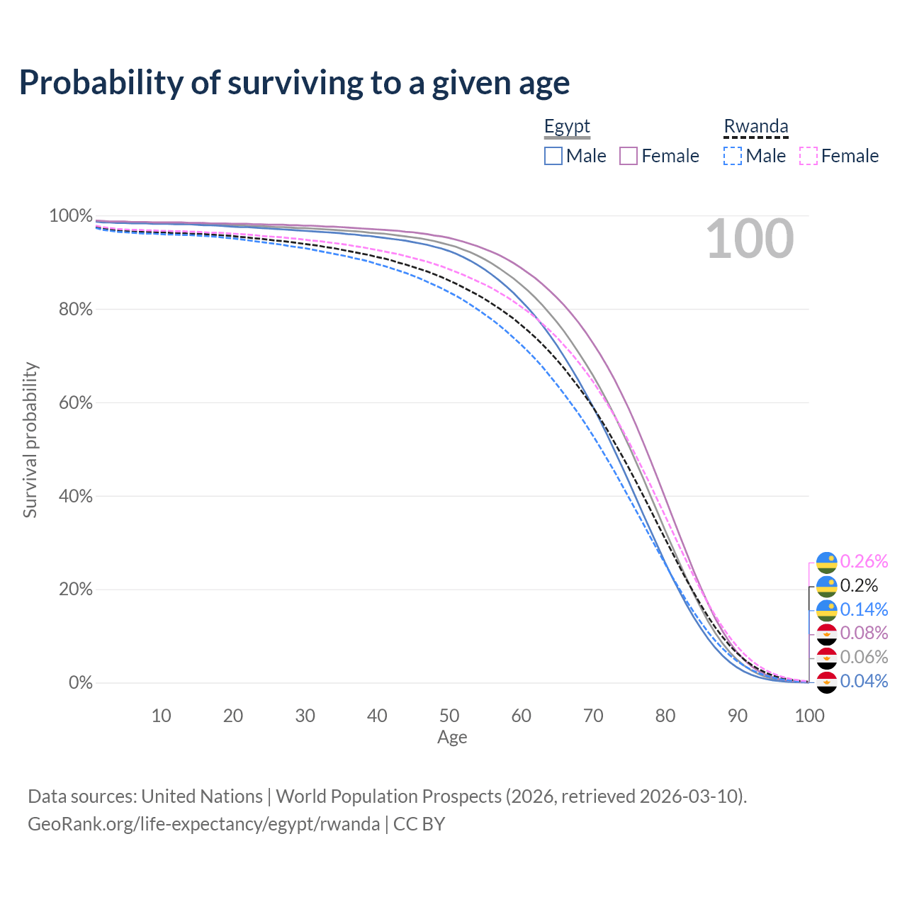 This life expectancy calculator shows the odds of living to 100, 95, 90, and below based on current age for both males and females in Egypt and Rwanda, along with mean and median age of death. The calculations are based on the 2026 life tables (actuarial tables) from the UN World Population Prospects.