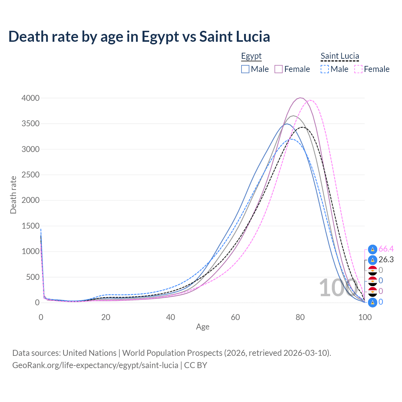 In Egypt, the most common age of death is 78, compared to 81 in Saint Lucia. The median age of death is 75.2 in Egypt and 76.8 in Saint Lucia, meaning only half of each cohort is expected to live past that age.