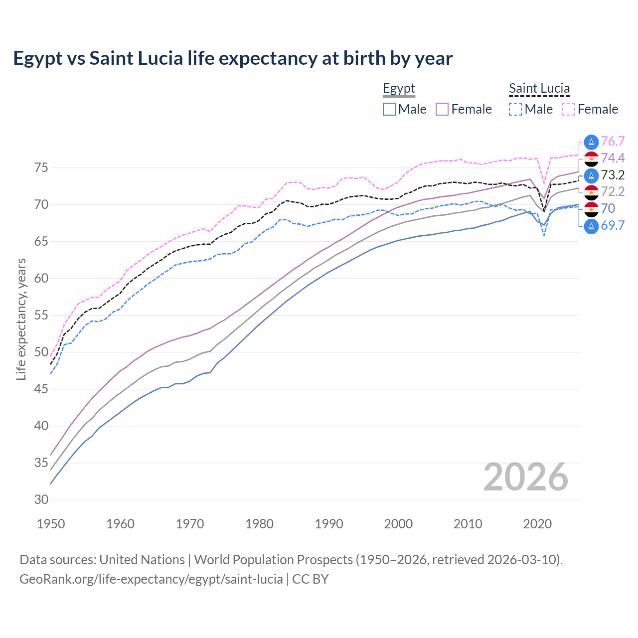 The average life expectancy at birth is 72.2 years in Egypt vs 73.2 in Saint Lucia. Egypt is ranked 122/197 by life expectancy, and Saint Lucia is 112/197. In Egypt, the life expectancy is 70 years for males and 74.4 years for females. In Saint Lucia, it's 69.7 years for males and 76.7 years for females.