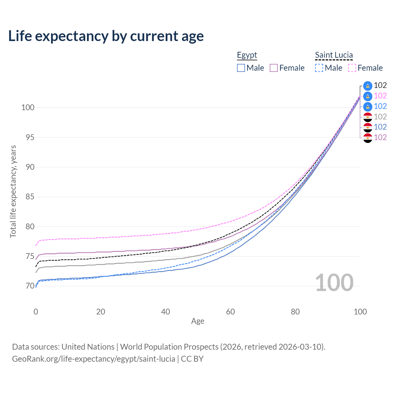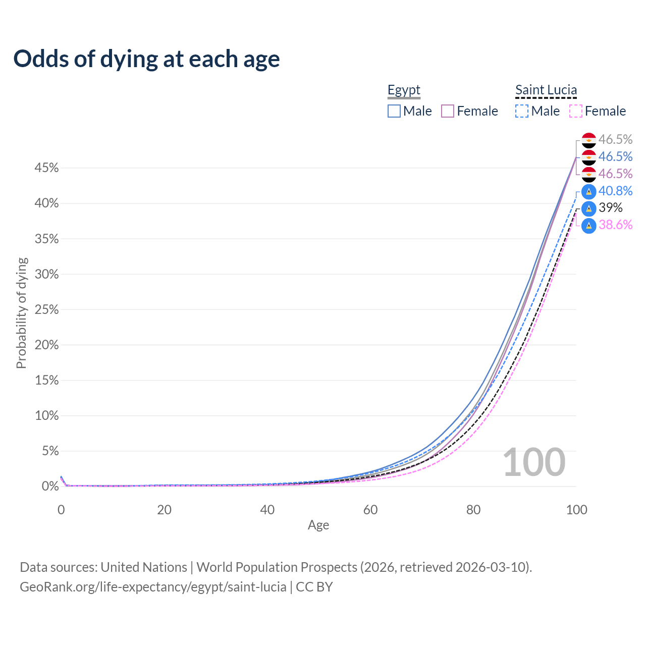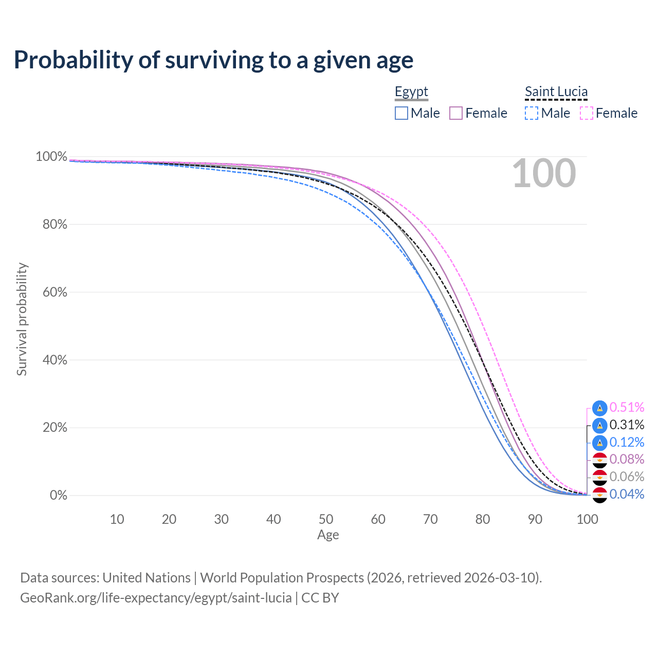 This life expectancy calculator shows the odds of living to 100, 95, 90, and below based on current age for both males and females in Egypt and Saint Lucia, along with mean and median age of death. The calculations are based on the 2026 life tables (actuarial tables) from the UN World Population Prospects.