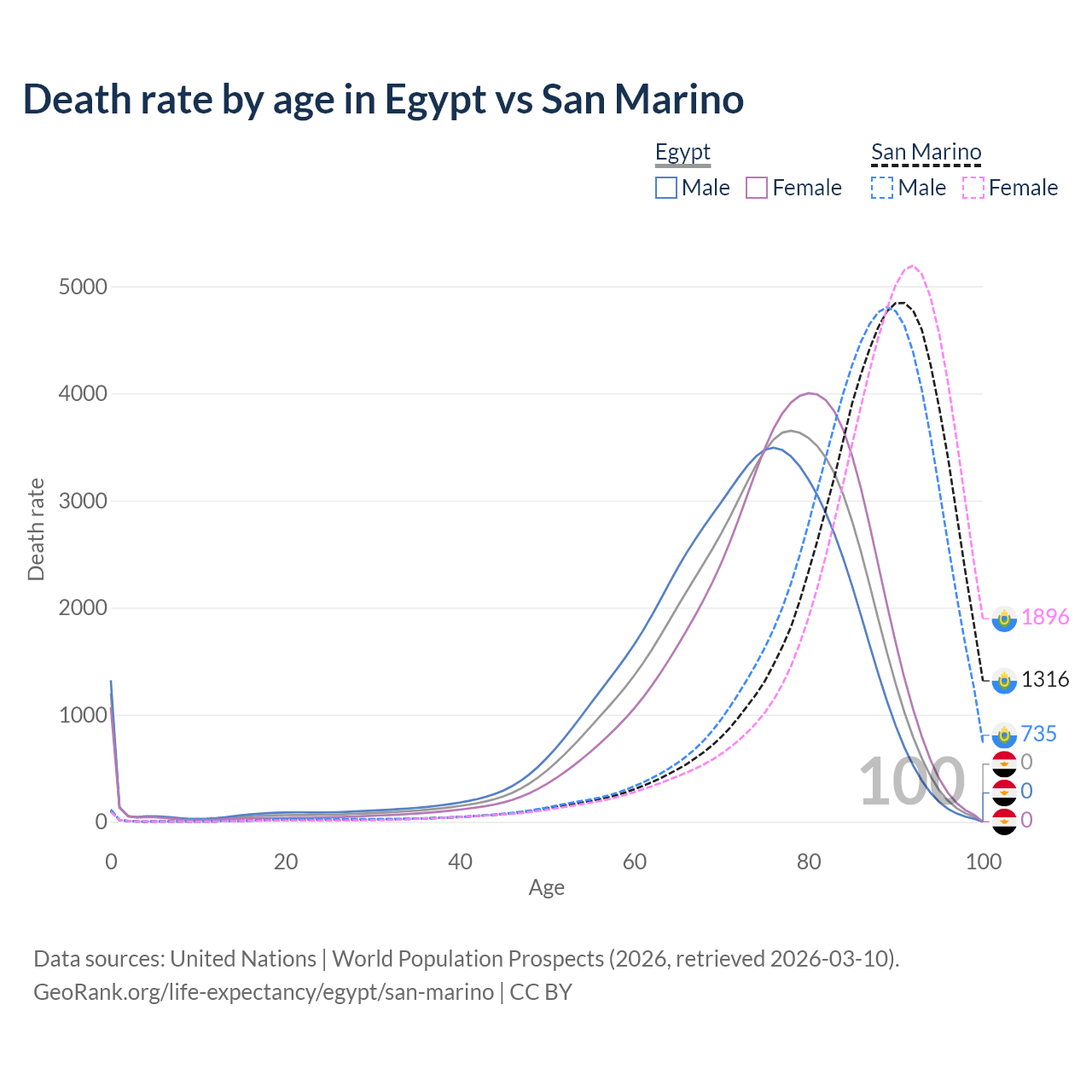 In Egypt, the most common age of death is 78, compared to 91 in San Marino. The median age of death is 75.2 in Egypt and 88.3 in San Marino, meaning only half of each cohort is expected to live past that age.