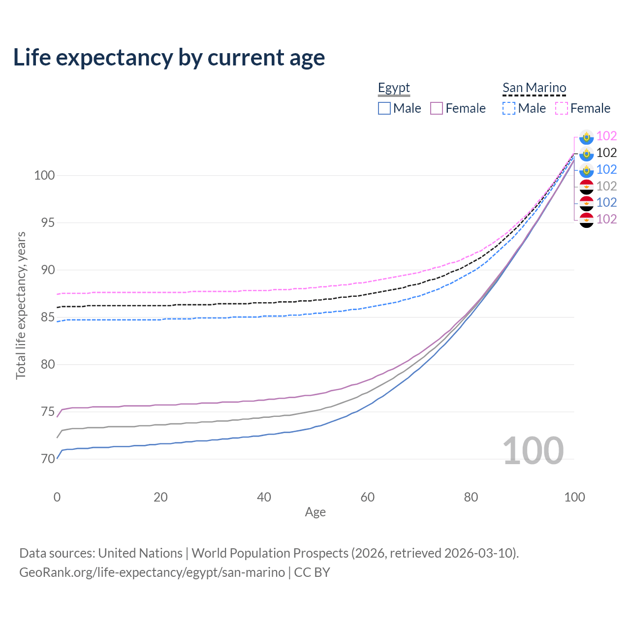The average life expectancy at birth is 72.2 years in Egypt vs 86 in San Marino. Egypt is ranked 122/197 by life expectancy, and San Marino is 2/197. In Egypt, the life expectancy is 70 years for males and 74.4 years for females. In San Marino, it's 84.5 years for males and 87.4 years for females.
