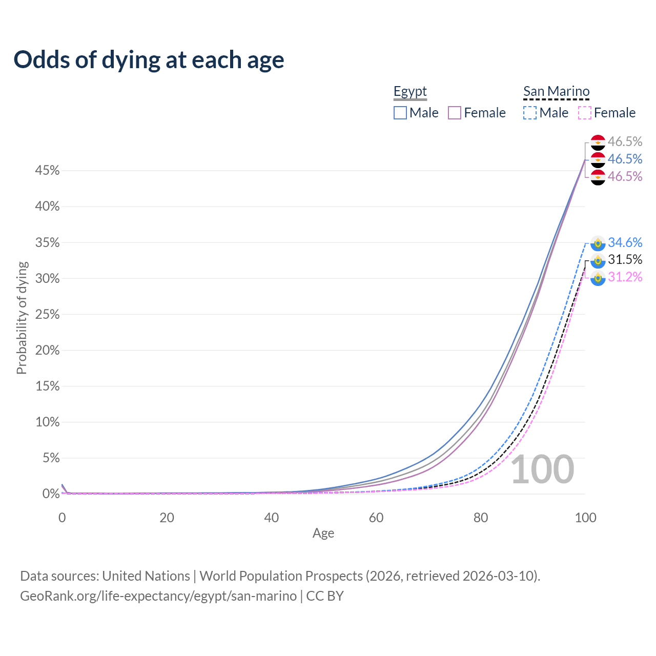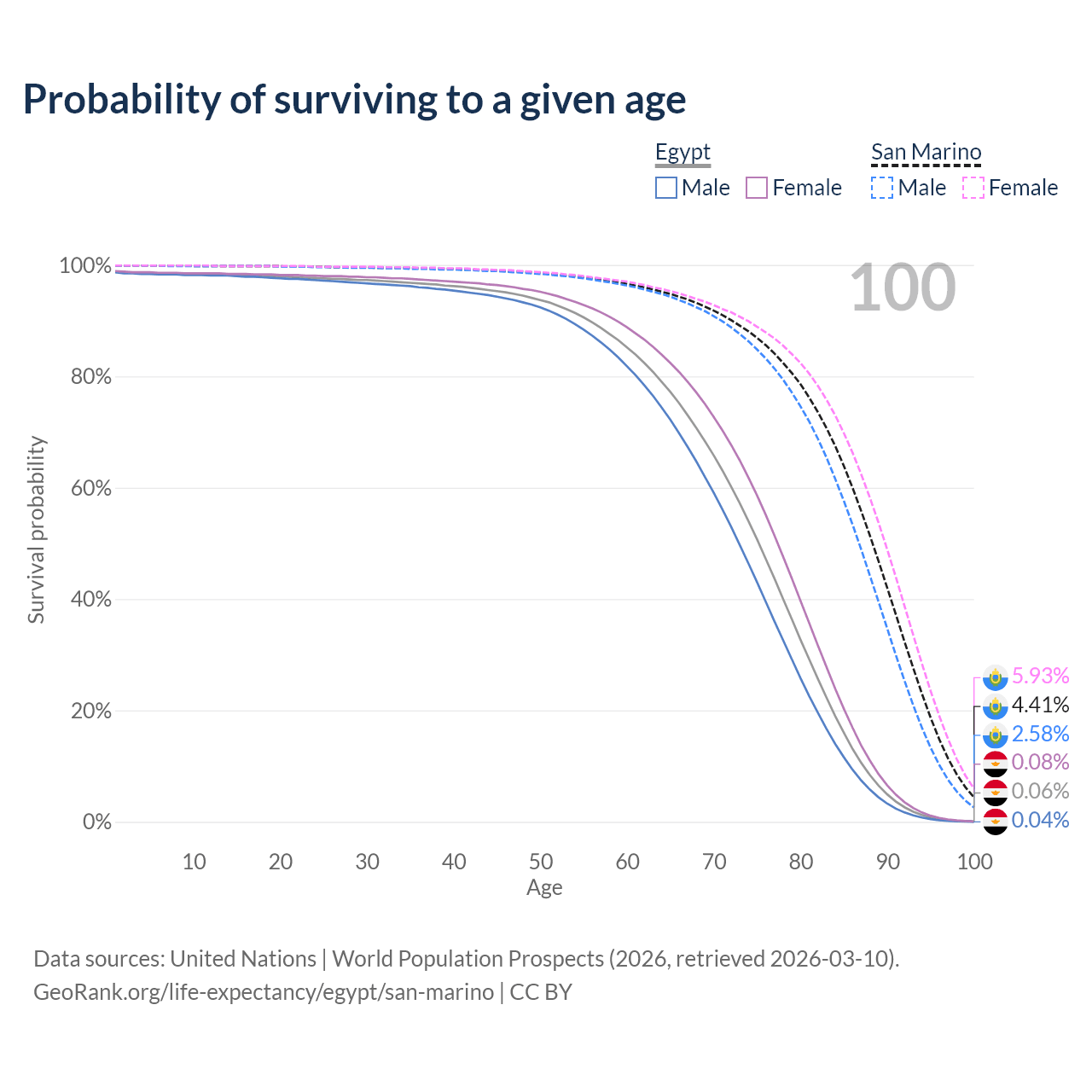 This life expectancy calculator shows the odds of living to 100, 95, 90, and below based on current age for both males and females in Egypt and San Marino, along with mean and median age of death. The calculations are based on the 2026 life tables (actuarial tables) from the UN World Population Prospects.