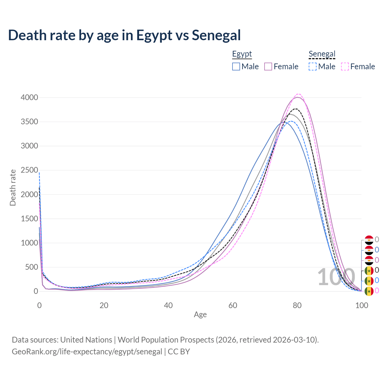 In Egypt, the most common age of death is 78, compared to 80 in Senegal. The median age of death is 75.2 in Egypt and 75 in Senegal, meaning only half of each cohort is expected to live past that age.