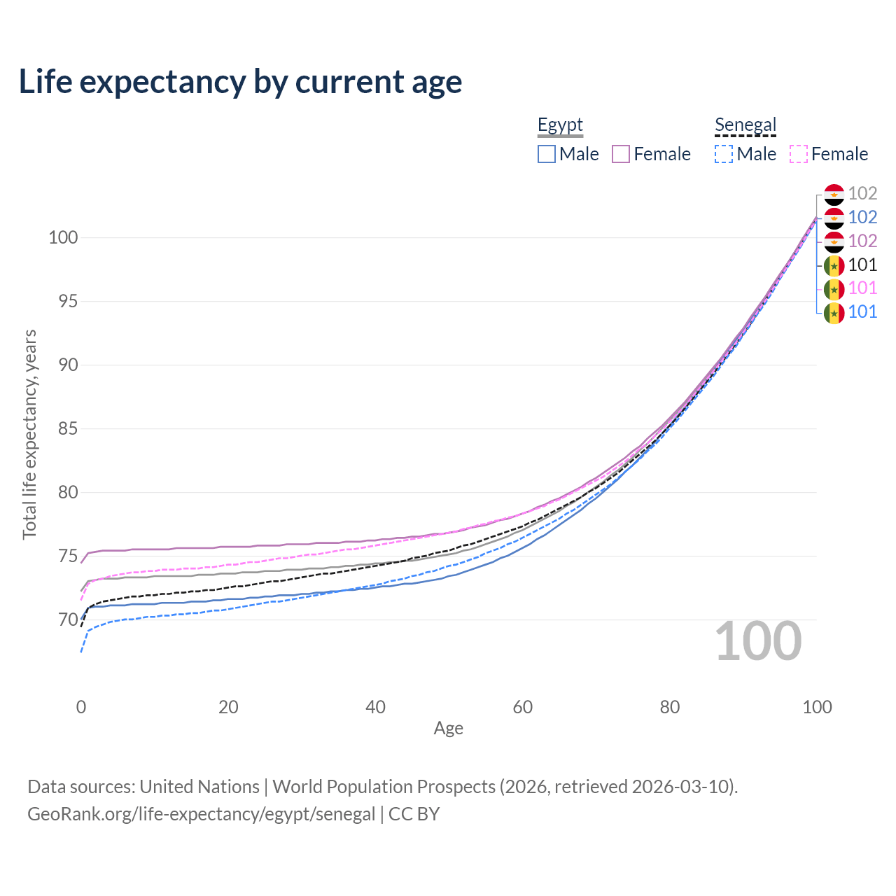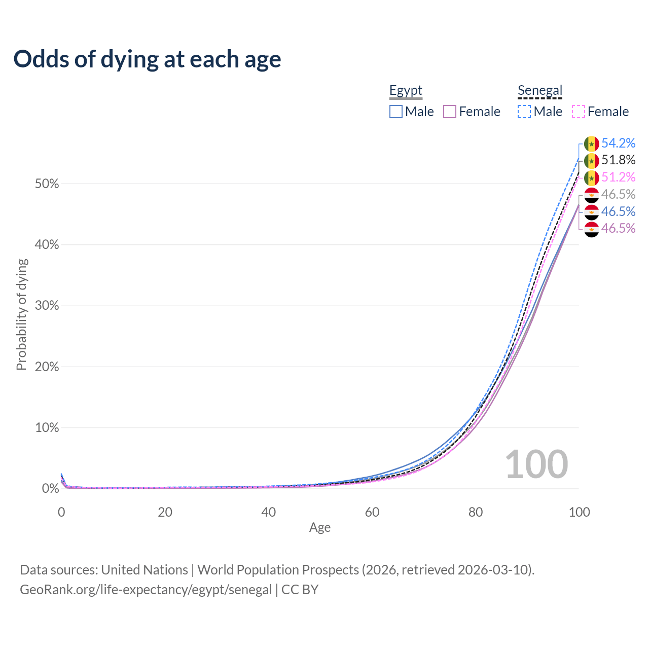 This life expectancy calculator shows the odds of living to 100, 95, 90, and below based on current age for both males and females in Egypt and Senegal, along with mean and median age of death. The calculations are based on the 2026 life tables (actuarial tables) from the UN World Population Prospects.