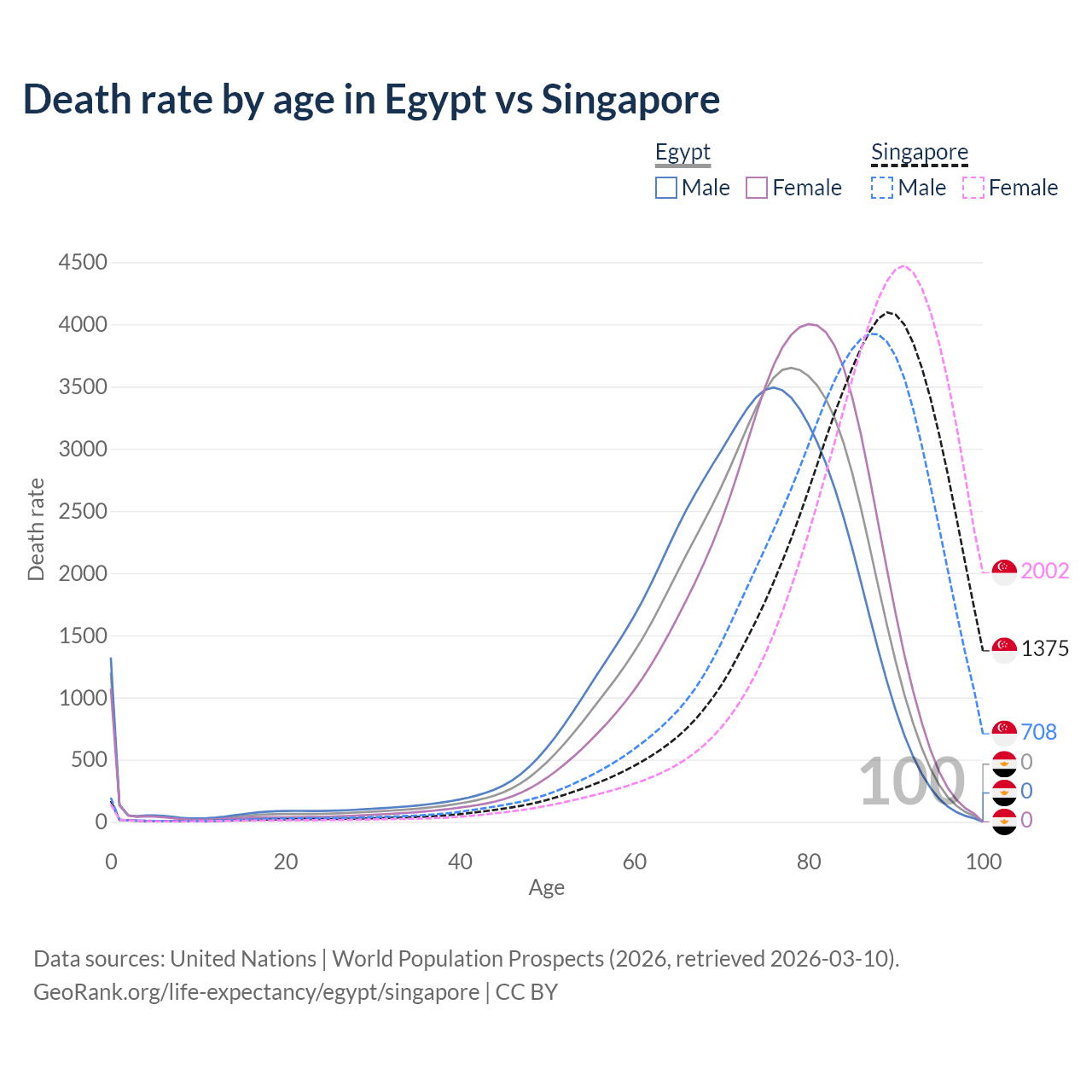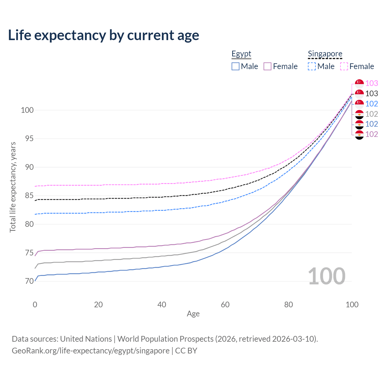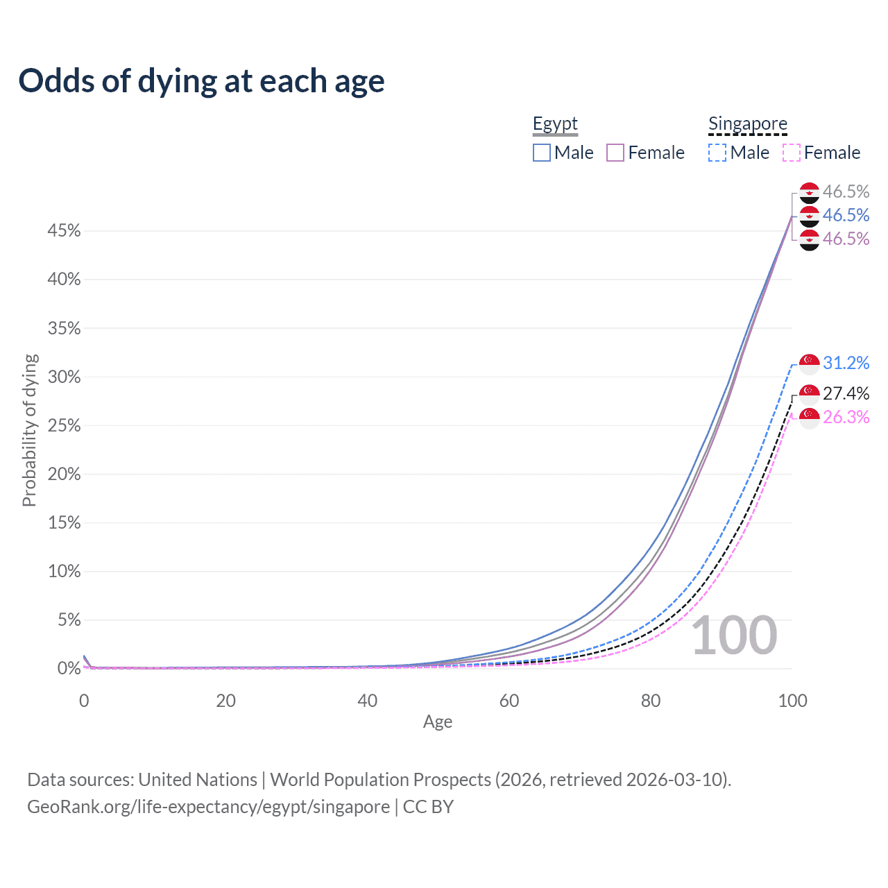 This life expectancy calculator shows the odds of living to 100, 95, 90, and below based on current age for both males and females in Egypt and Singapore, along with mean and median age of death. The calculations are based on the 2026 life tables (actuarial tables) from the UN World Population Prospects.