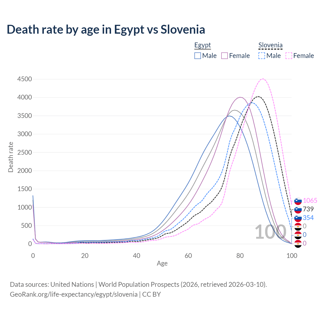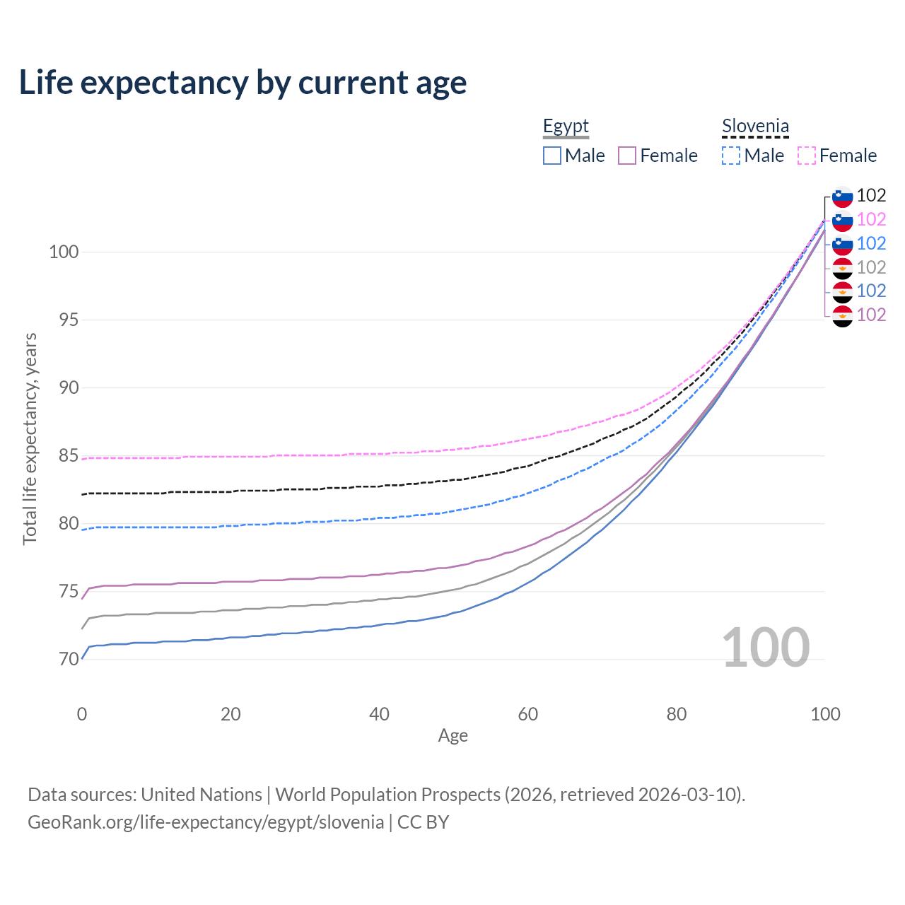 This life expectancy calculator shows the odds of living to 100, 95, 90, and below based on current age for both males and females in Egypt and Slovenia, along with mean and median age of death. The calculations are based on the 2026 life tables (actuarial tables) from the UN World Population Prospects.