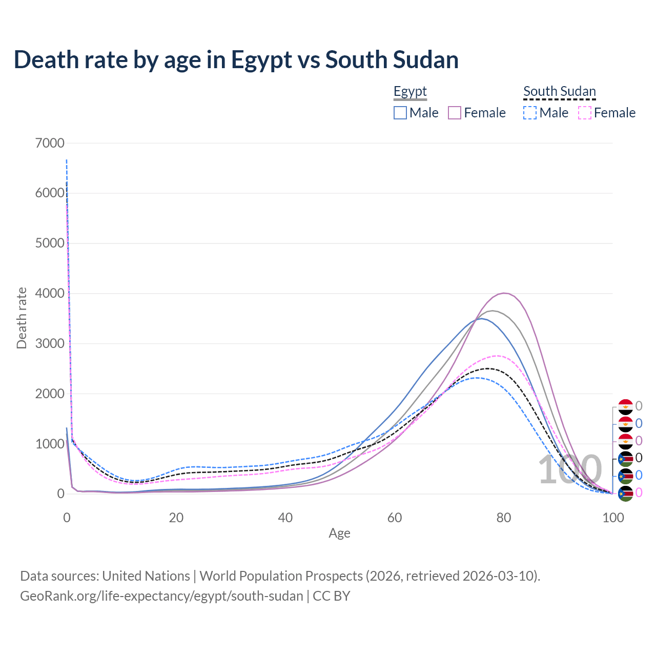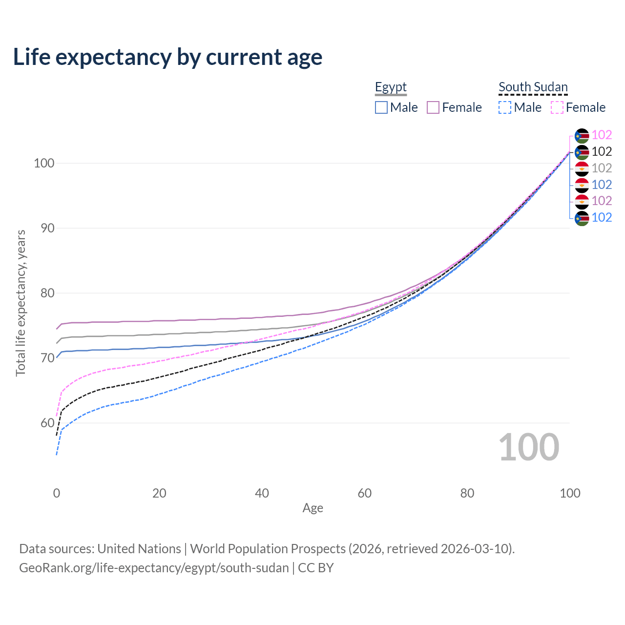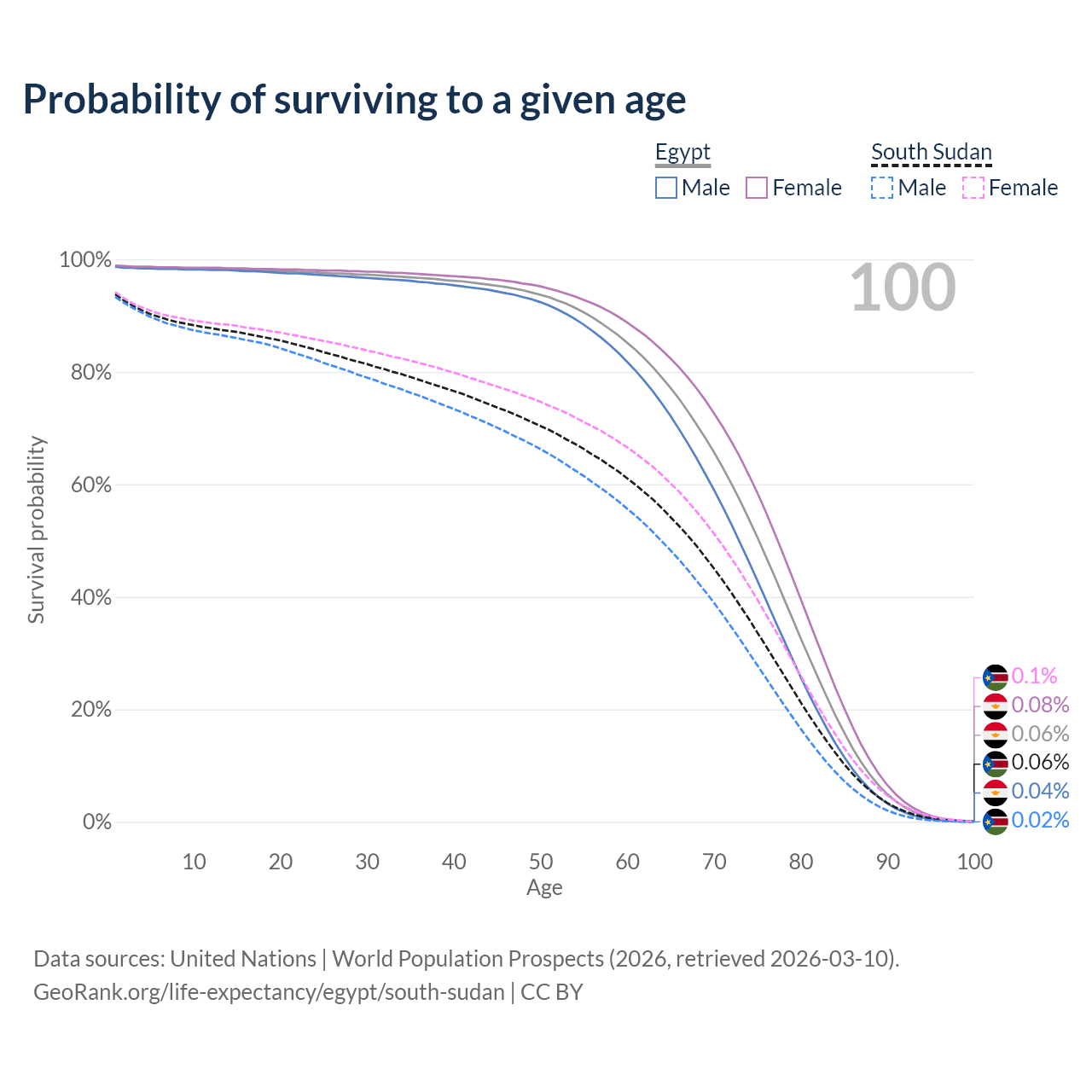 This life expectancy calculator shows the odds of living to 100, 95, 90, and below based on current age for both males and females in Egypt and South Sudan, along with mean and median age of death. The calculations are based on the 2026 life tables (actuarial tables) from the UN World Population Prospects.