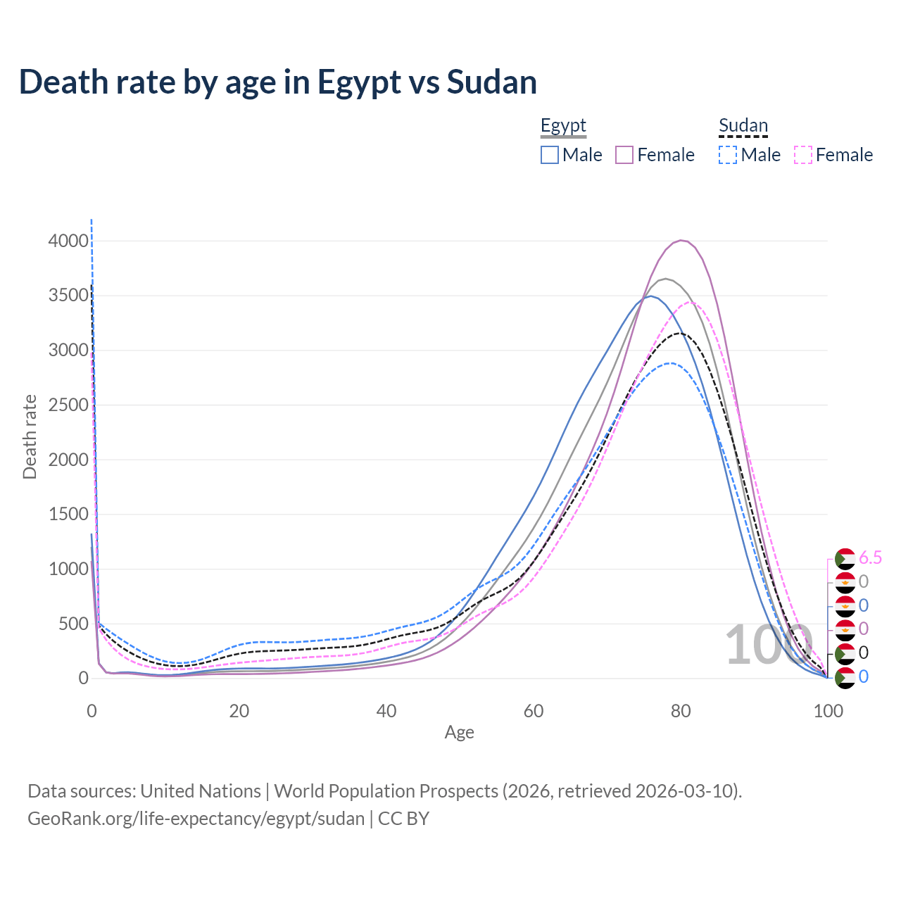 In Egypt, the most common age of death is 78, compared to 0 in Sudan. The median age of death is 75.2 in Egypt and 74.1 in Sudan, meaning only half of each cohort is expected to live past that age.