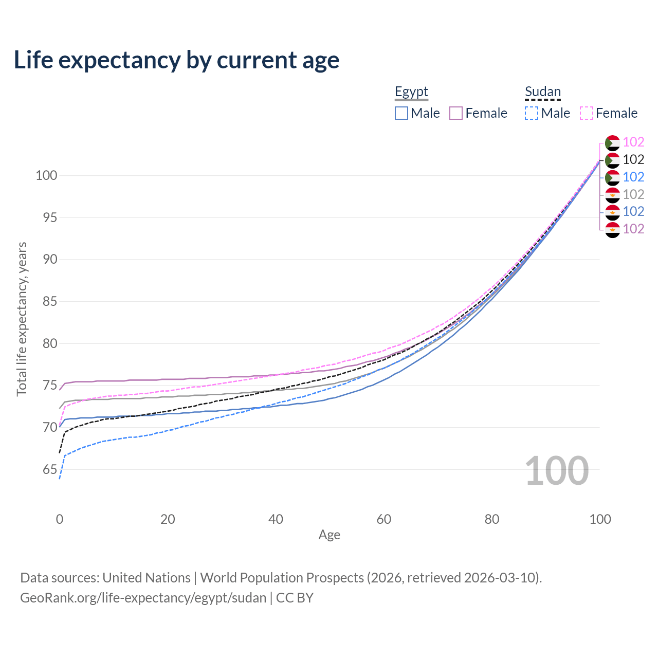 This life expectancy calculator shows the odds of living to 100, 95, 90, and below based on current age for both males and females in Egypt and Sudan, along with mean and median age of death. The calculations are based on the 2026 life tables (actuarial tables) from the UN World Population Prospects.