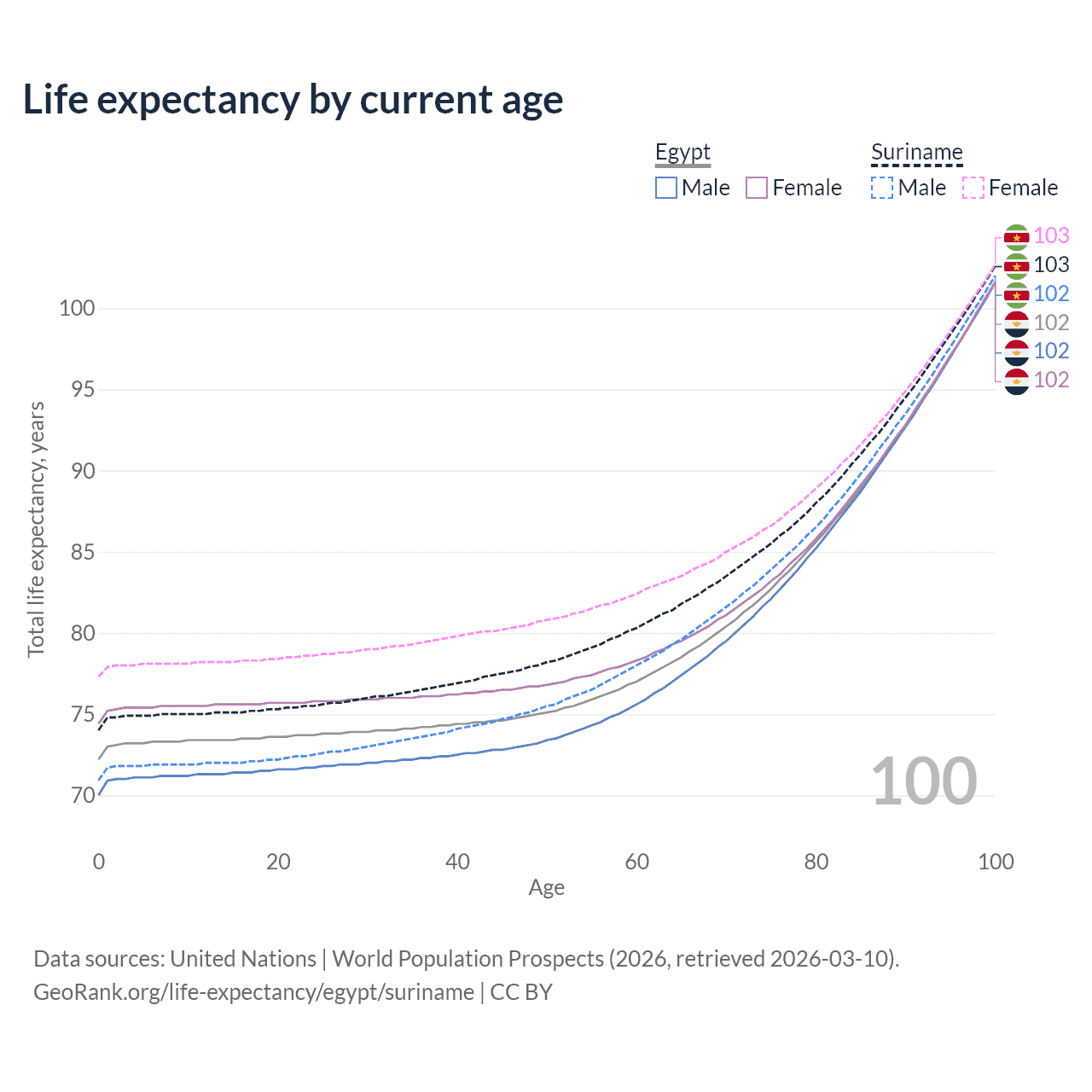 This life expectancy calculator shows the odds of living to 100, 95, 90, and below based on current age for both males and females in Egypt and Suriname, along with mean and median age of death. The calculations are based on the 2026 life tables (actuarial tables) from the UN World Population Prospects.