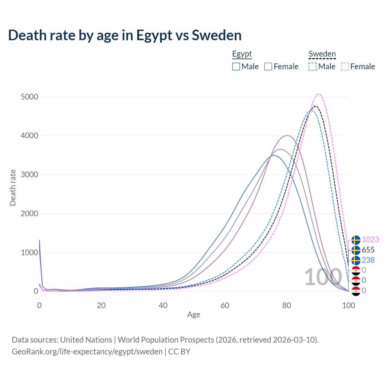 In Egypt, the most common age of death is 78, compared to 89 in Sweden. The median age of death is 75.2 in Egypt and 86.5 in Sweden, meaning only half of each cohort is expected to live past that age.