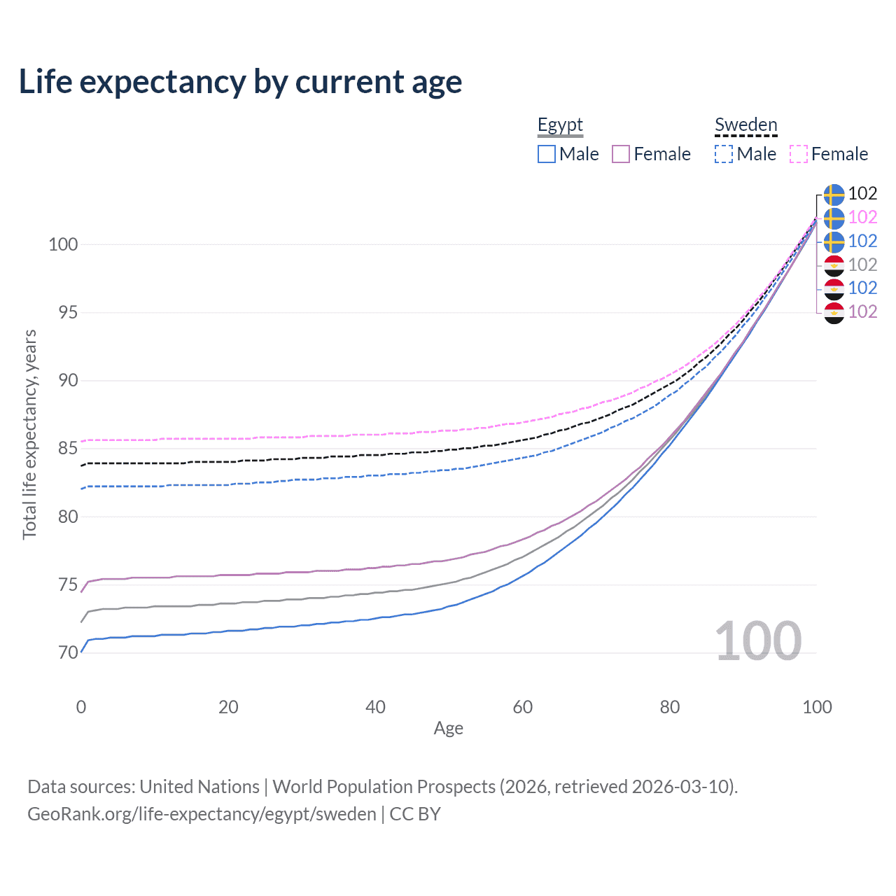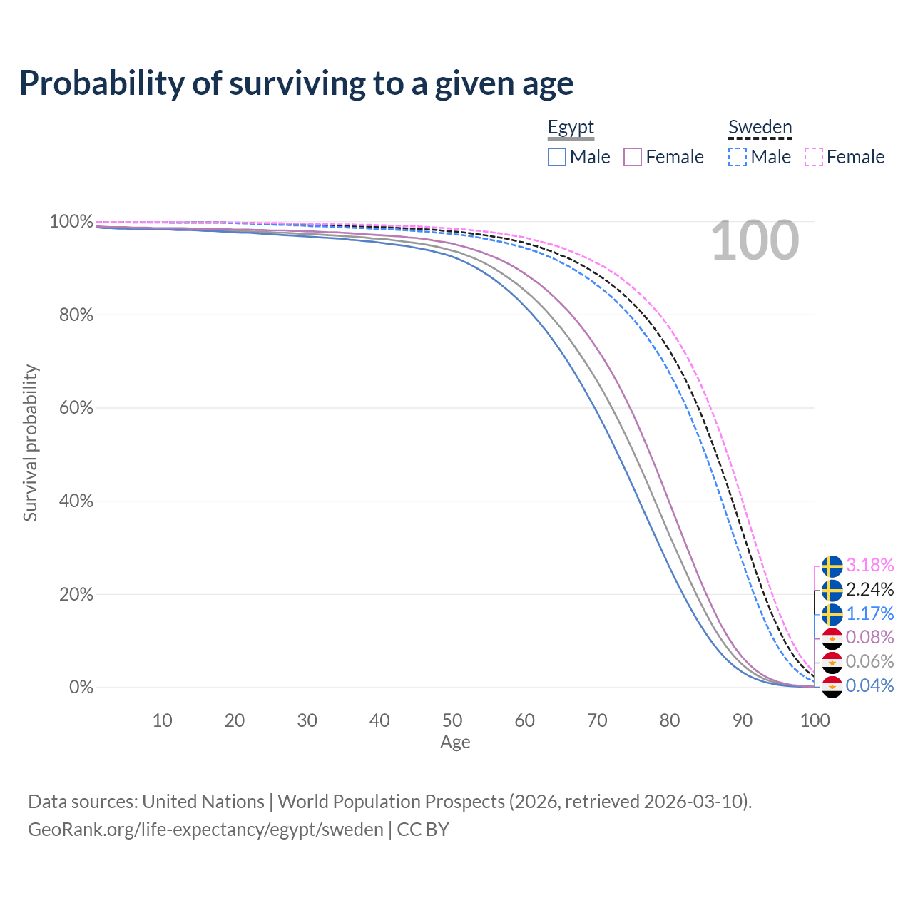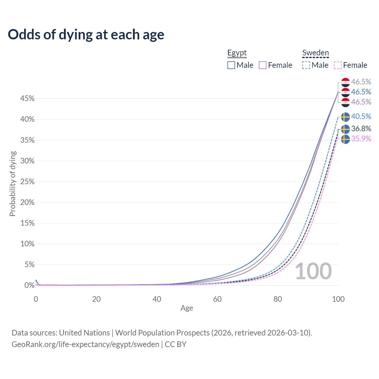 This life expectancy calculator shows the odds of living to 100, 95, 90, and below based on current age for both males and females in Egypt and Sweden, along with mean and median age of death. The calculations are based on the 2026 life tables (actuarial tables) from the UN World Population Prospects.