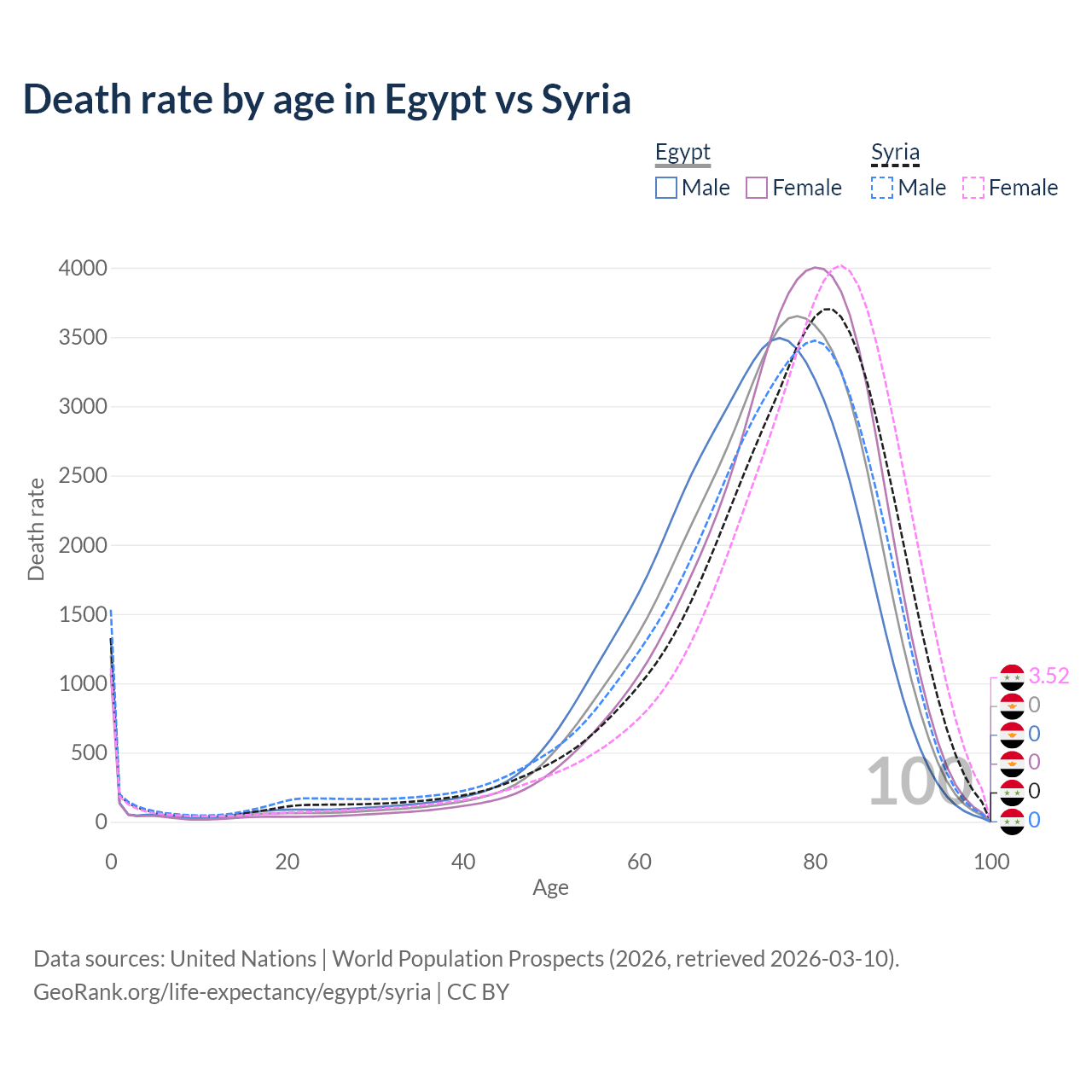 In Egypt, the most common age of death is 78, compared to 82 in Syria. The median age of death is 75.2 in Egypt and 77.7 in Syria, meaning only half of each cohort is expected to live past that age.