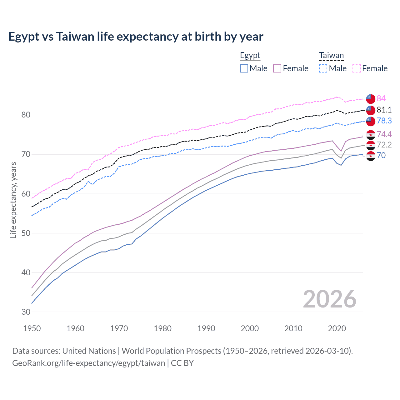 The average life expectancy at birth is 72.2 years in Egypt vs 81.1 in Taiwan. Egypt is ranked 122/197 by life expectancy, and Taiwan is 40/197. In Egypt, the life expectancy is 70 years for males and 74.4 years for females. In Taiwan, it's 78.3 years for males and 84 years for females.