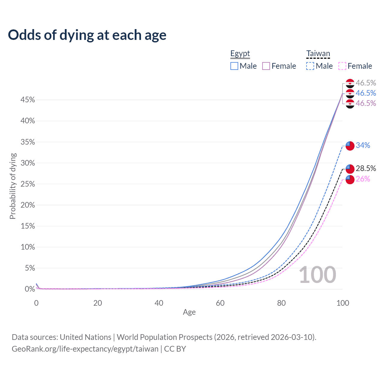 This life expectancy calculator shows the odds of living to 100, 95, 90, and below based on current age for both males and females in Egypt and Taiwan, along with mean and median age of death. The calculations are based on the 2026 life tables (actuarial tables) from the UN World Population Prospects.