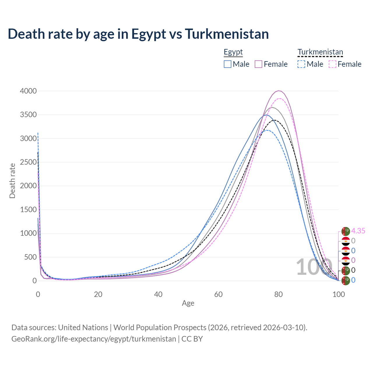In Egypt, the most common age of death is 78, compared to 79 in Turkmenistan. The median age of death is 75.2 in Egypt and 75.1 in Turkmenistan, meaning only half of each cohort is expected to live past that age.