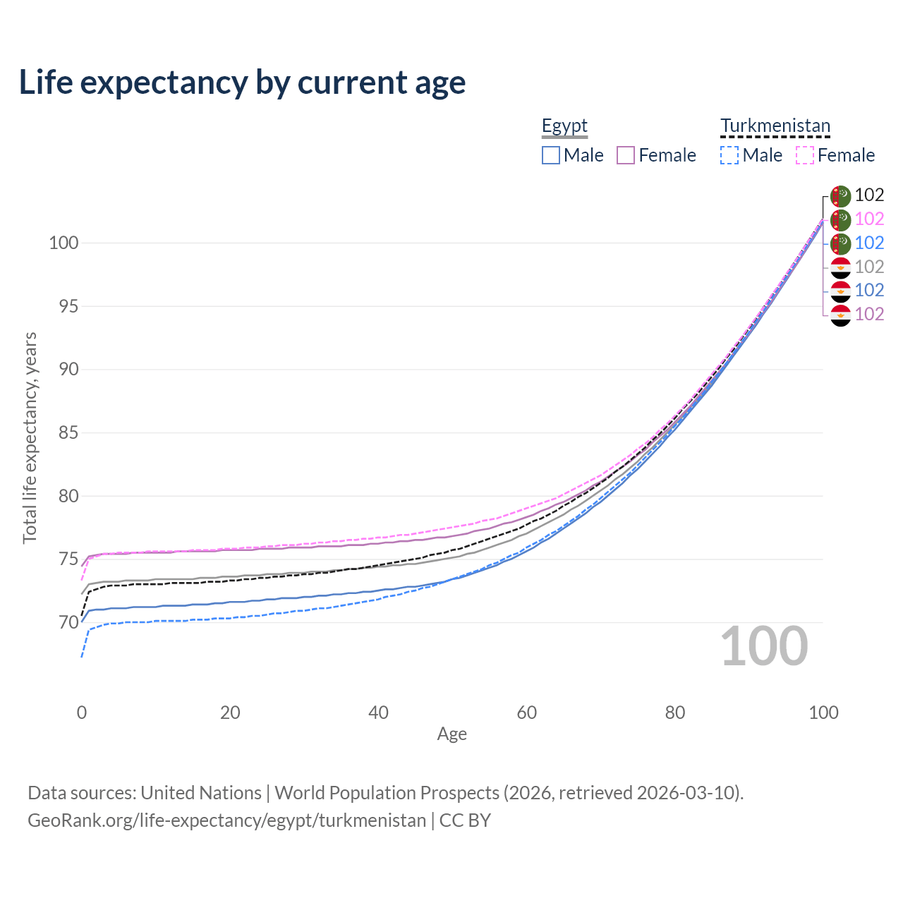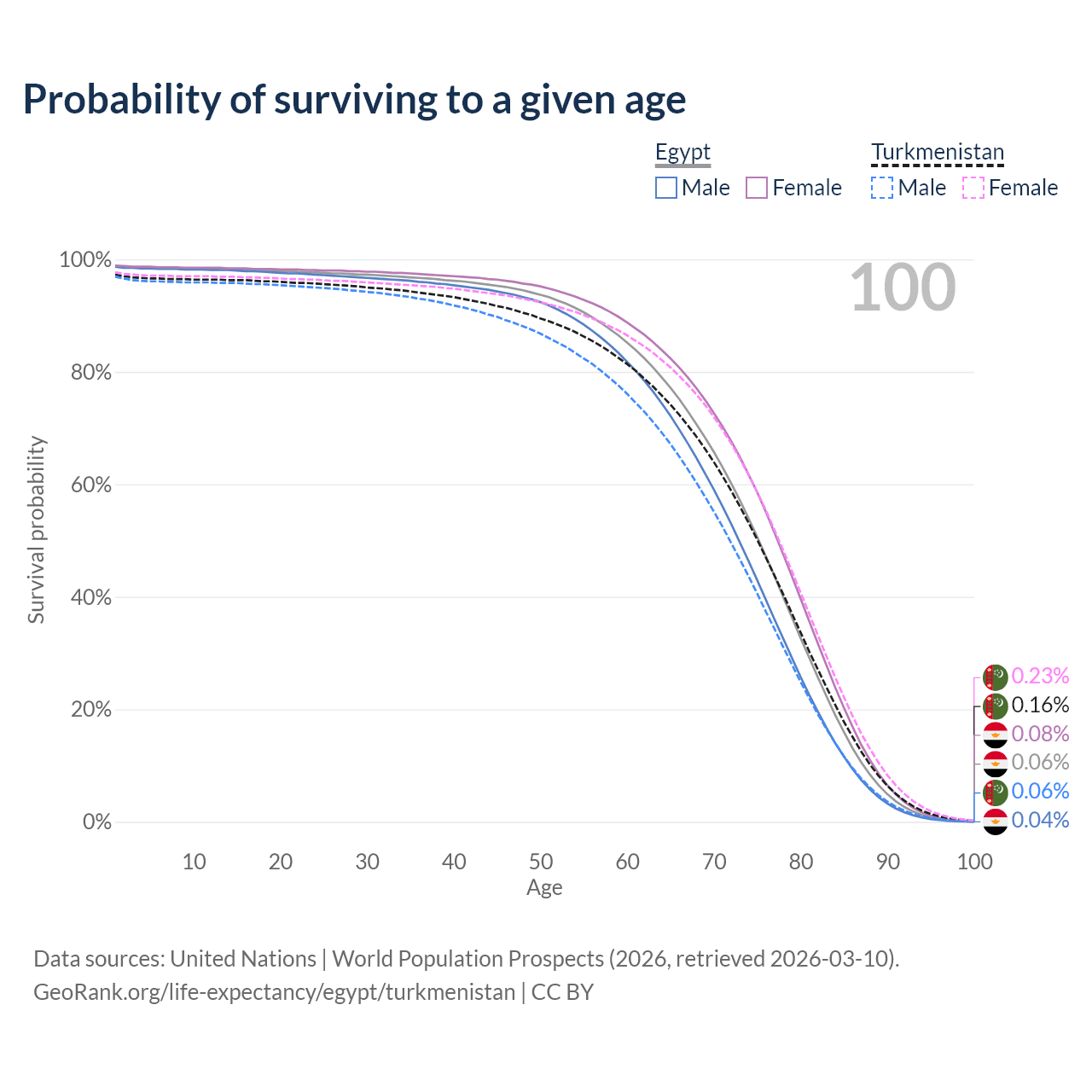 This life expectancy calculator shows the odds of living to 100, 95, 90, and below based on current age for both males and females in Egypt and Turkmenistan, along with mean and median age of death. The calculations are based on the 2026 life tables (actuarial tables) from the UN World Population Prospects.