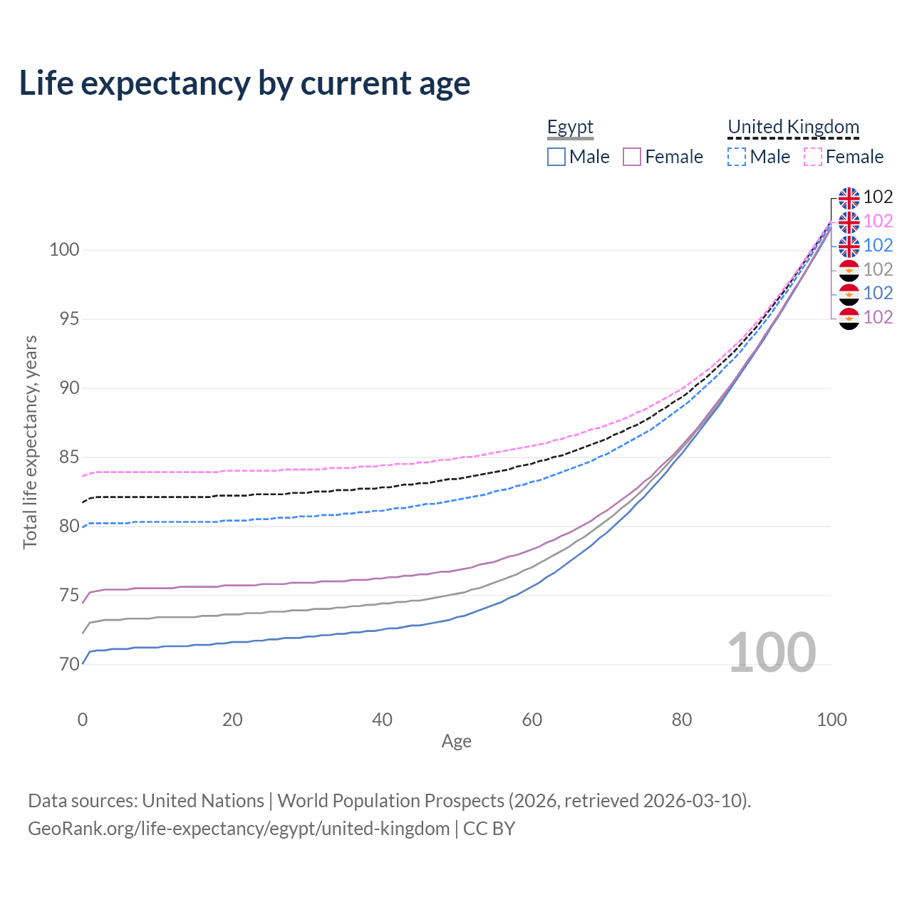 This life expectancy calculator shows the odds of living to 100, 95, 90, and below based on current age for both males and females in Egypt and the United Kingdom, along with mean and median age of death. The calculations are based on the 2026 life tables (actuarial tables) from the UN World Population Prospects.
