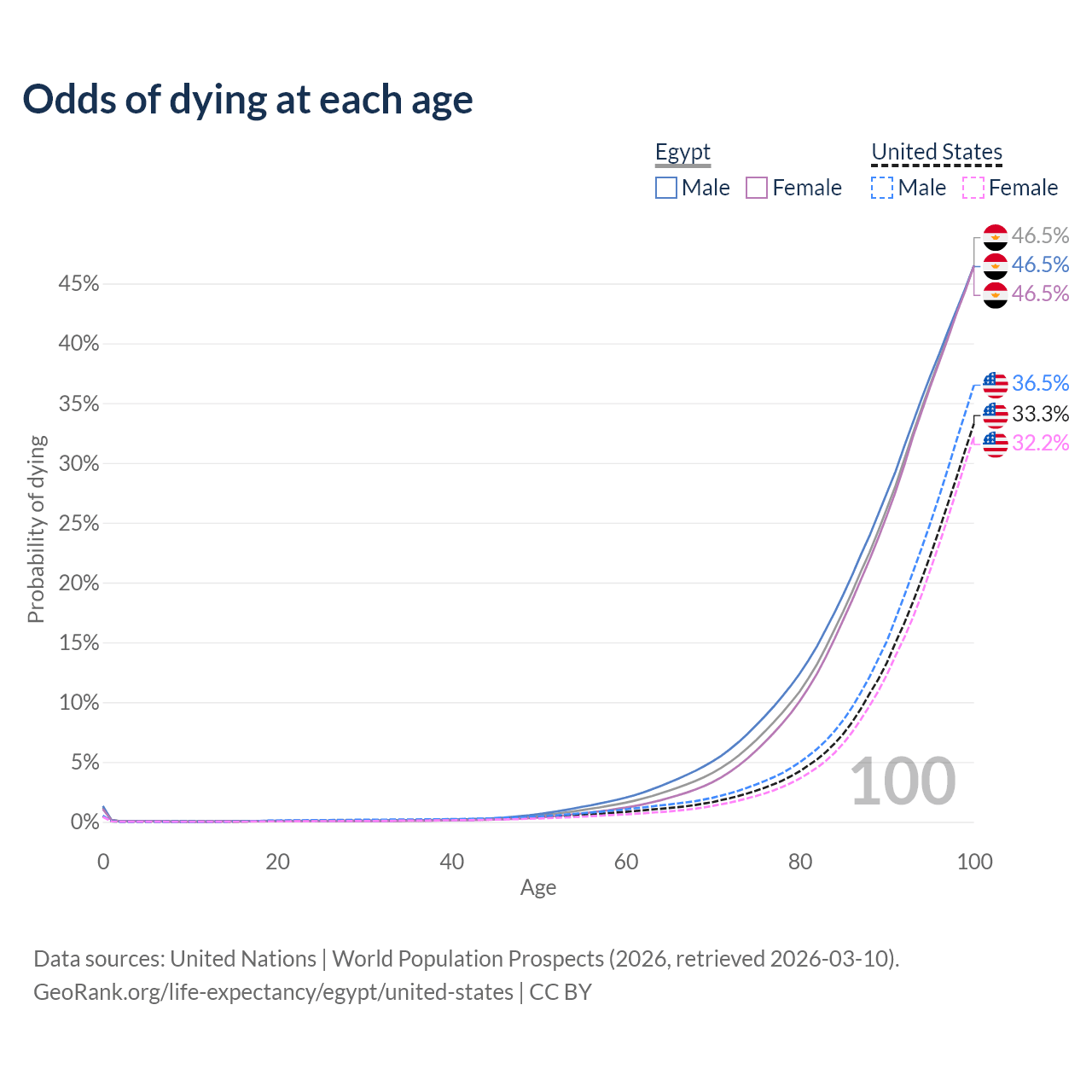 This life expectancy calculator shows the odds of living to 100, 95, 90, and below based on current age for both males and females in Egypt and the United States, along with mean and median age of death. The calculations are based on the 2026 life tables (actuarial tables) from the UN World Population Prospects.