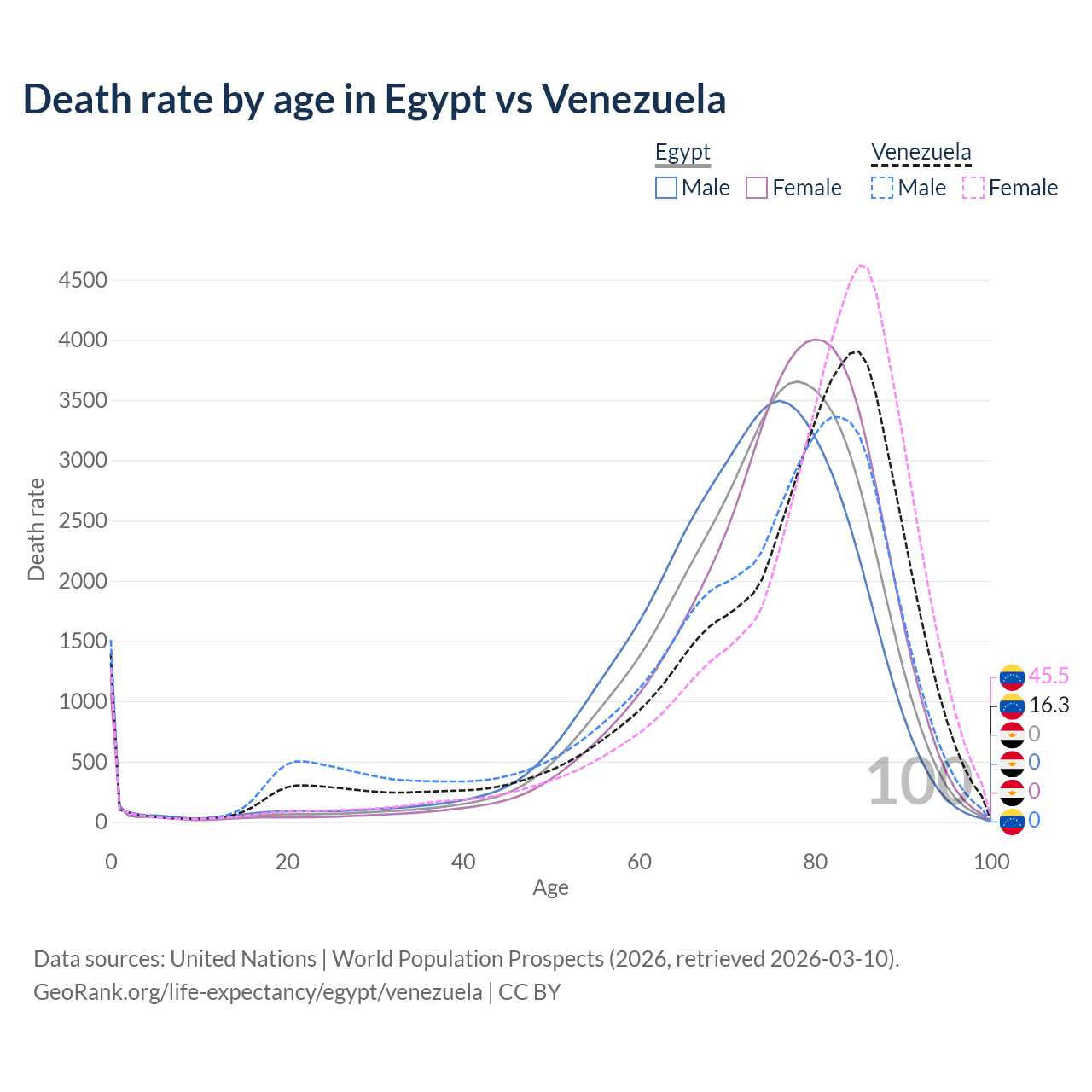 In Egypt, the most common age of death is 78, compared to 85 in Venezuela. The median age of death is 75.2 in Egypt and 79 in Venezuela, meaning only half of each cohort is expected to live past that age.