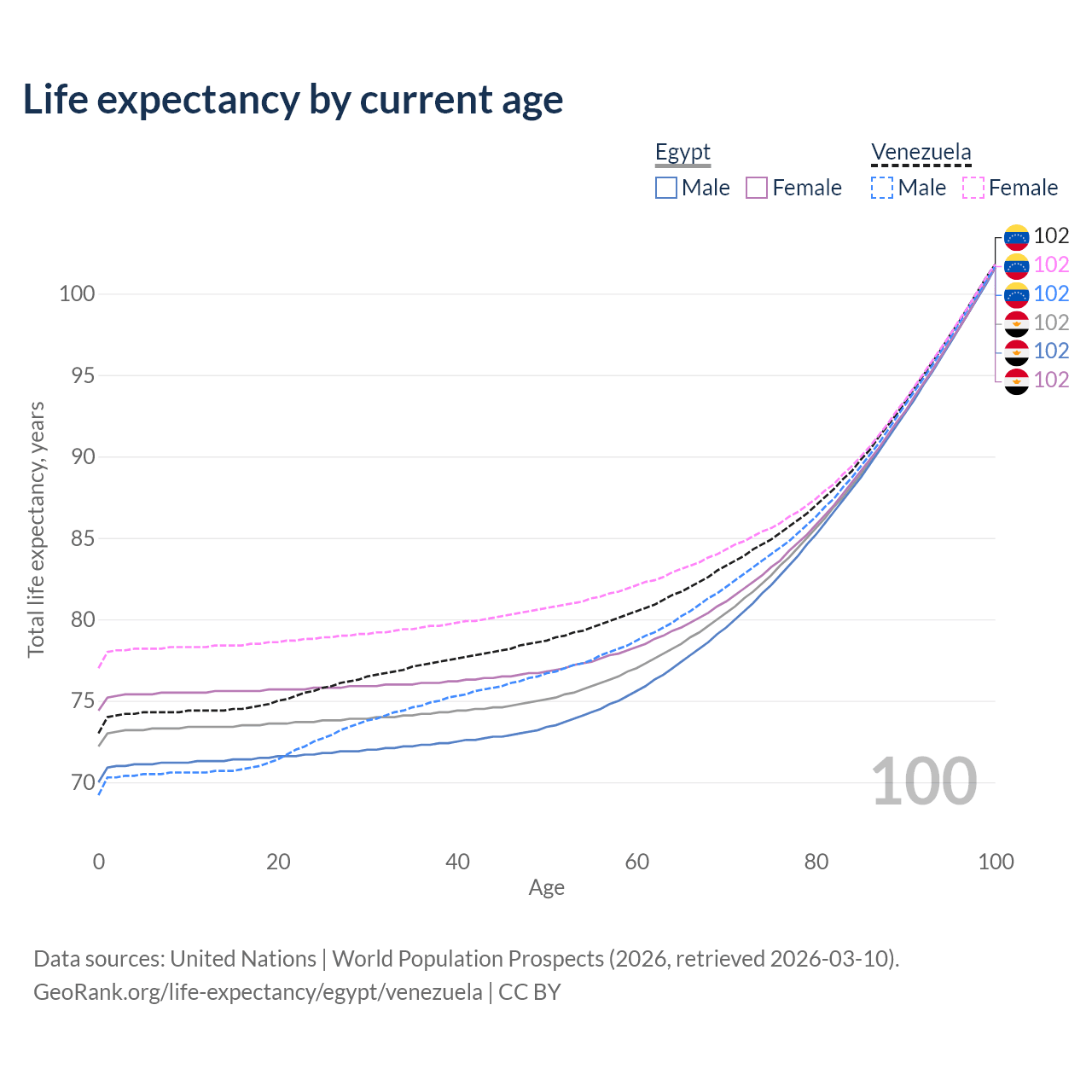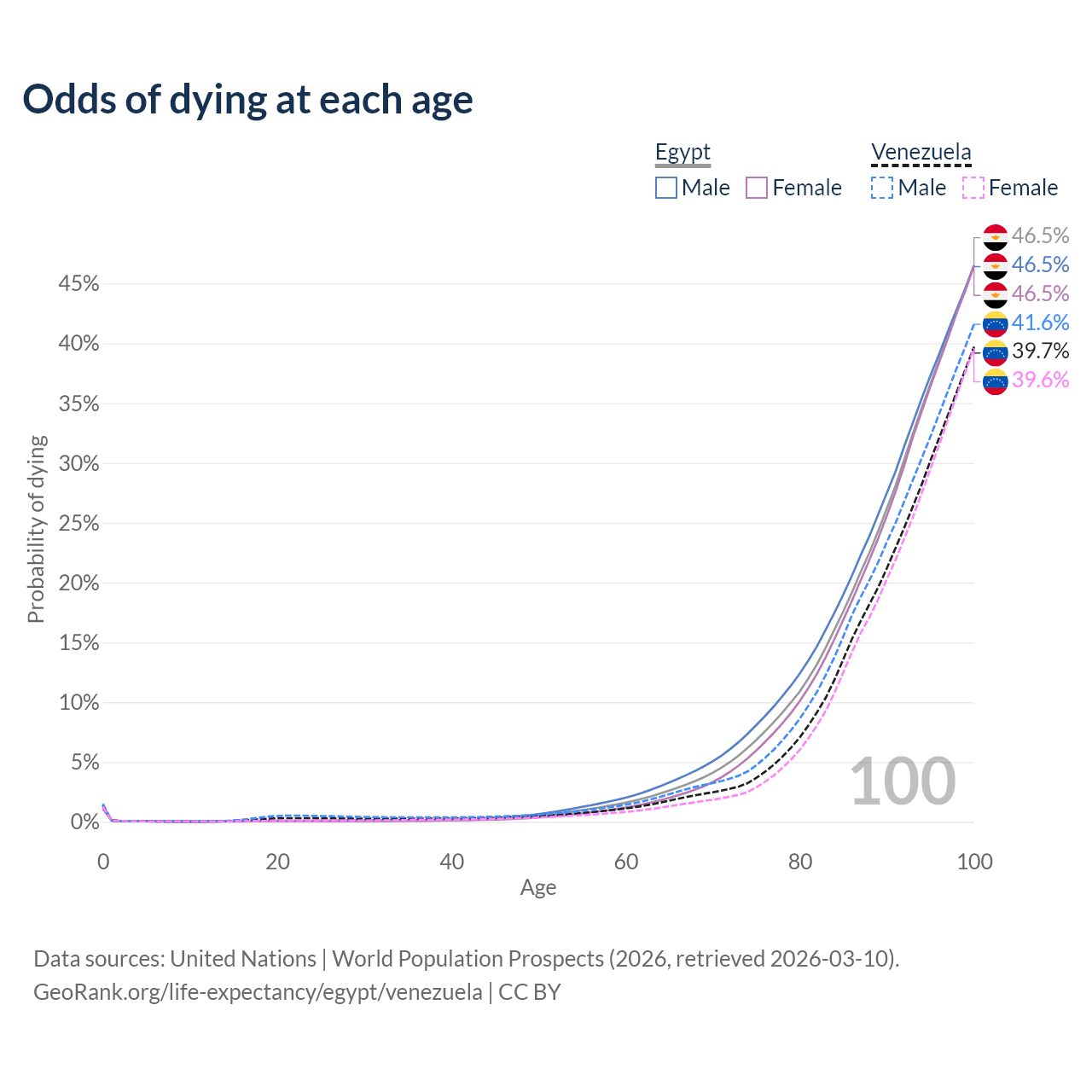 This life expectancy calculator shows the odds of living to 100, 95, 90, and below based on current age for both males and females in Egypt and Venezuela, along with mean and median age of death. The calculations are based on the 2026 life tables (actuarial tables) from the UN World Population Prospects.