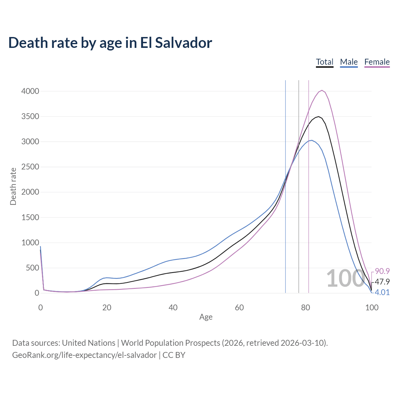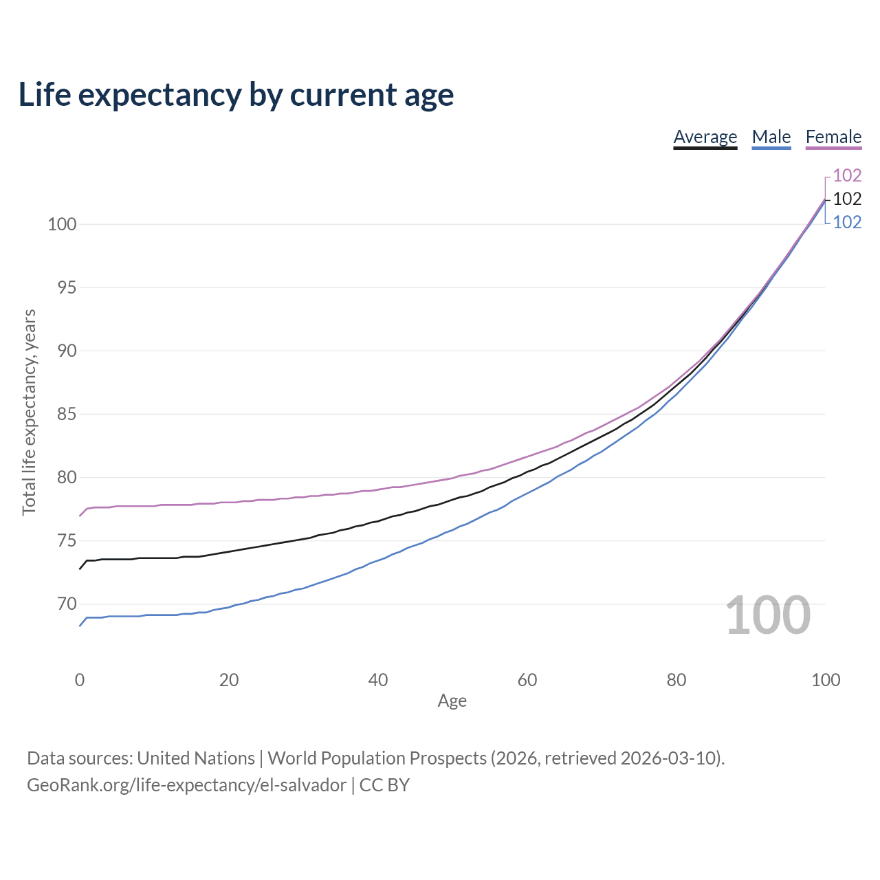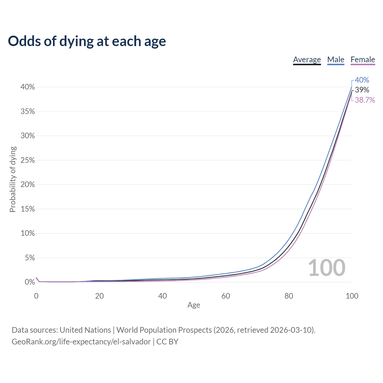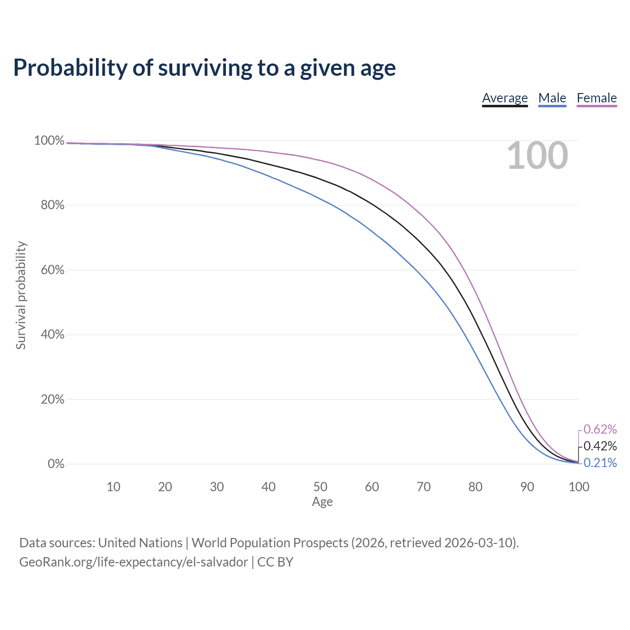 This life expectancy calculator shows the odds of living to 100, 95, 90, and below based on current age for both males and females in El Salvador, along with mean and median age of death. The calculations are based on the 2026 life tables (actuarial tables) from the UN World Population Prospects.