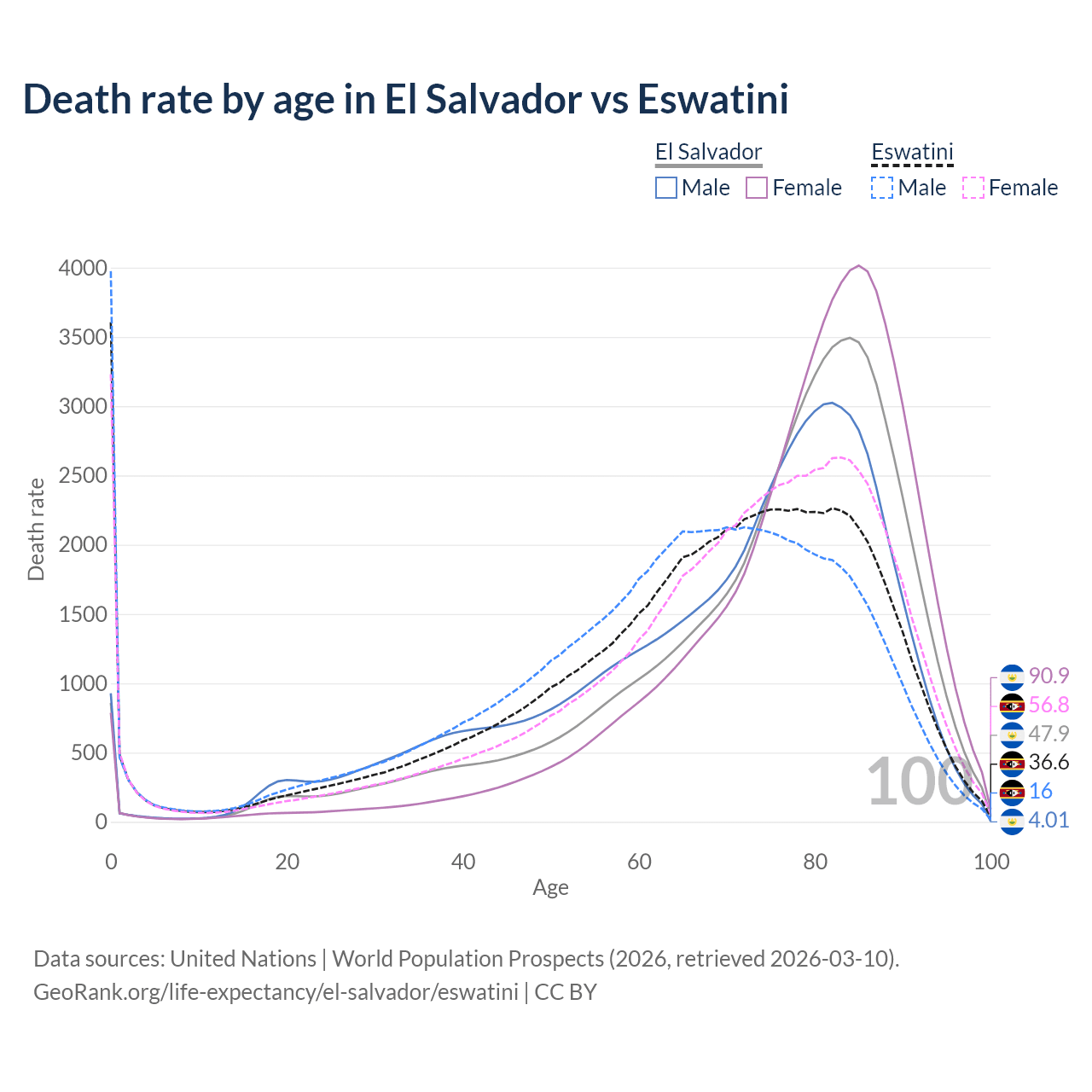 This life expectancy calculator shows the odds of living to 100, 95, 90, and below based on current age for both males and females in El Salvador and Eswatini, along with mean and median age of death. The calculations are based on the 2026 life tables (actuarial tables) from the UN World Population Prospects.