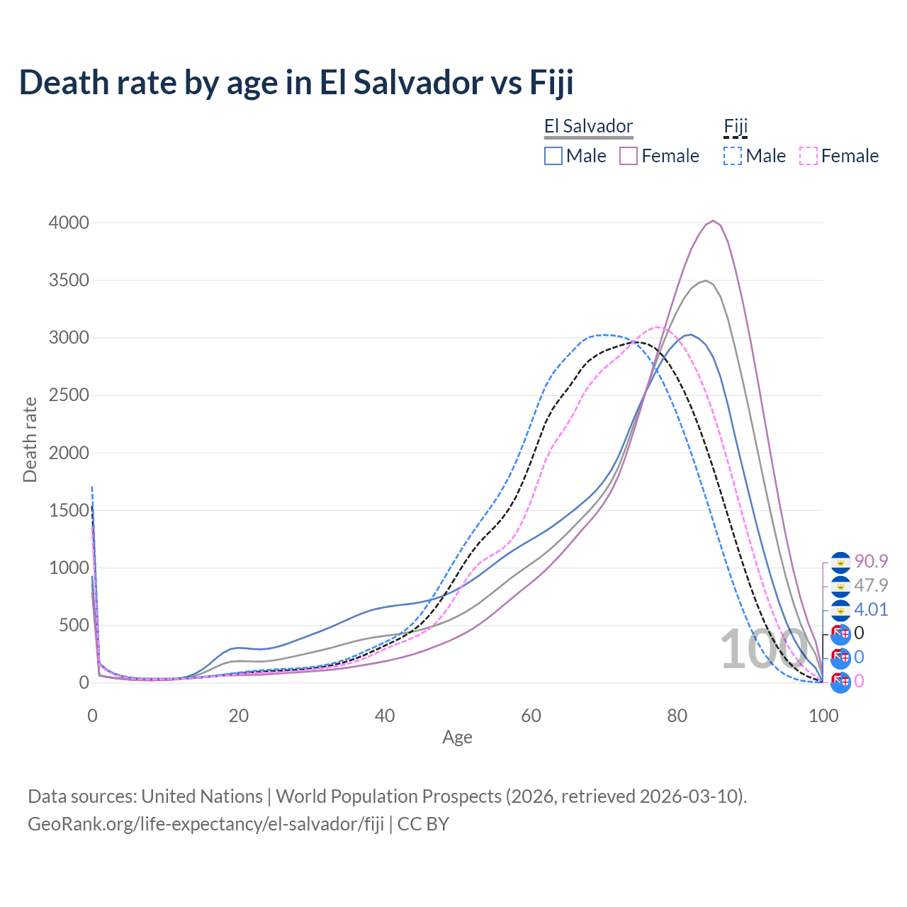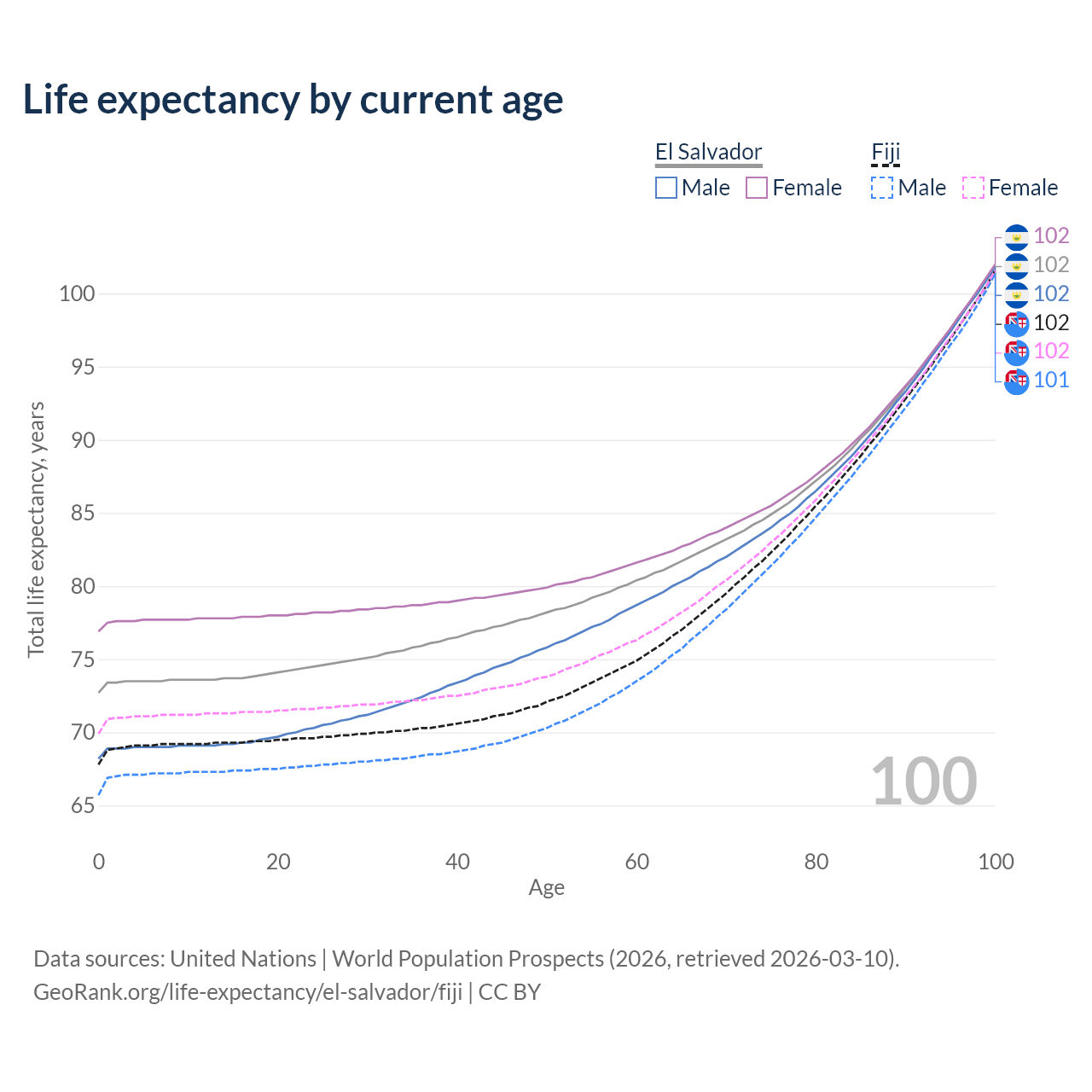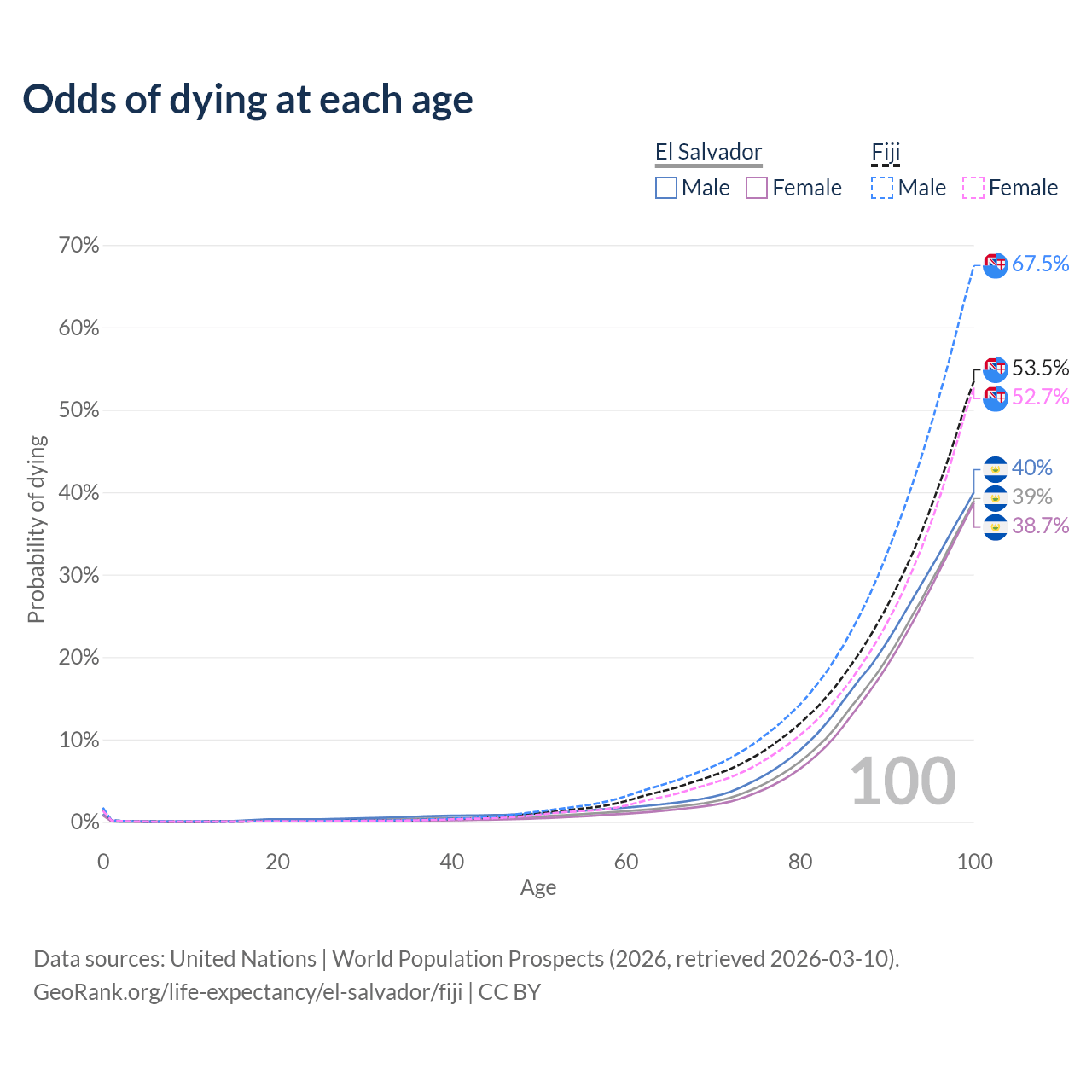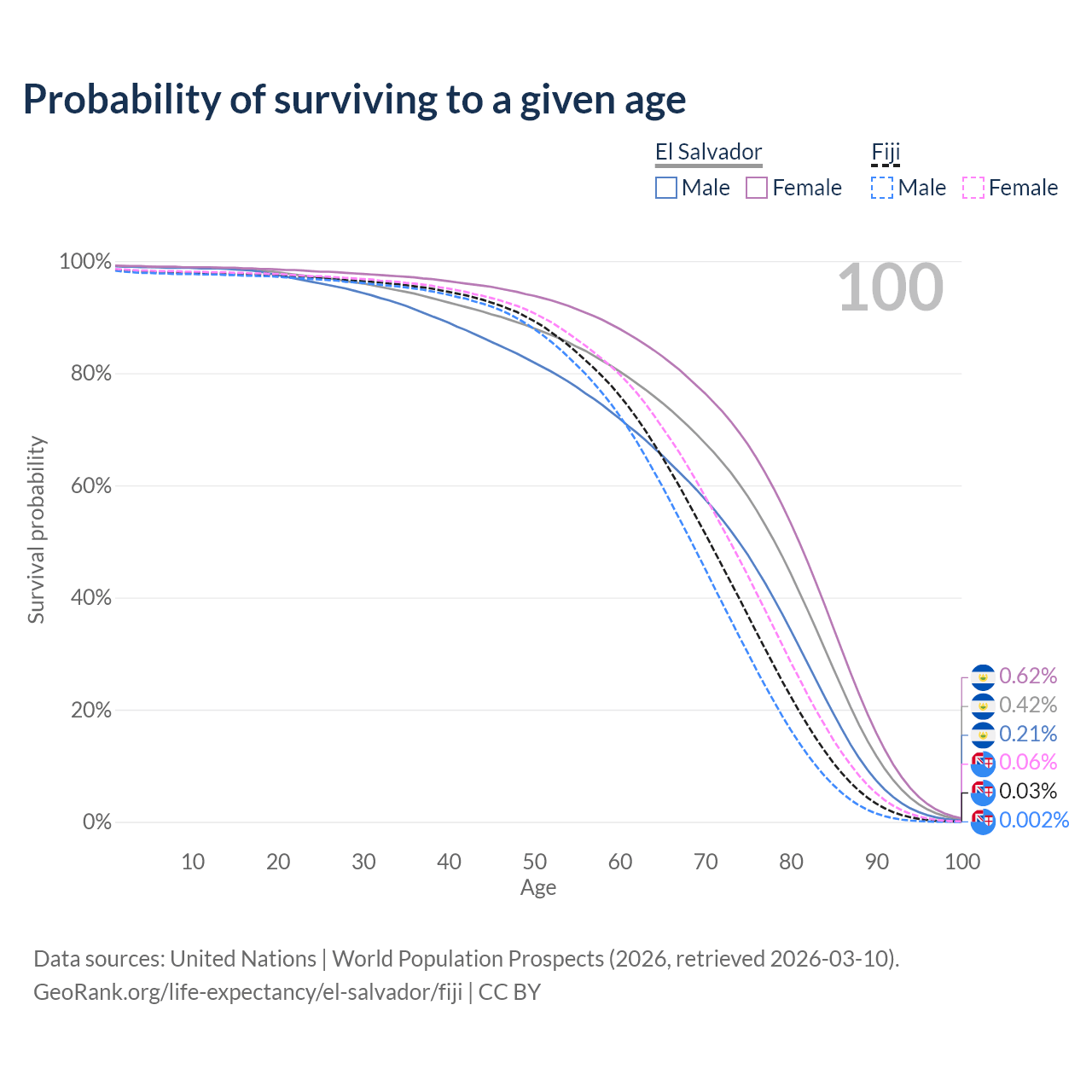 This life expectancy calculator shows the odds of living to 100, 95, 90, and below based on current age for both males and females in El Salvador and Fiji, along with mean and median age of death. The calculations are based on the 2026 life tables (actuarial tables) from the UN World Population Prospects.