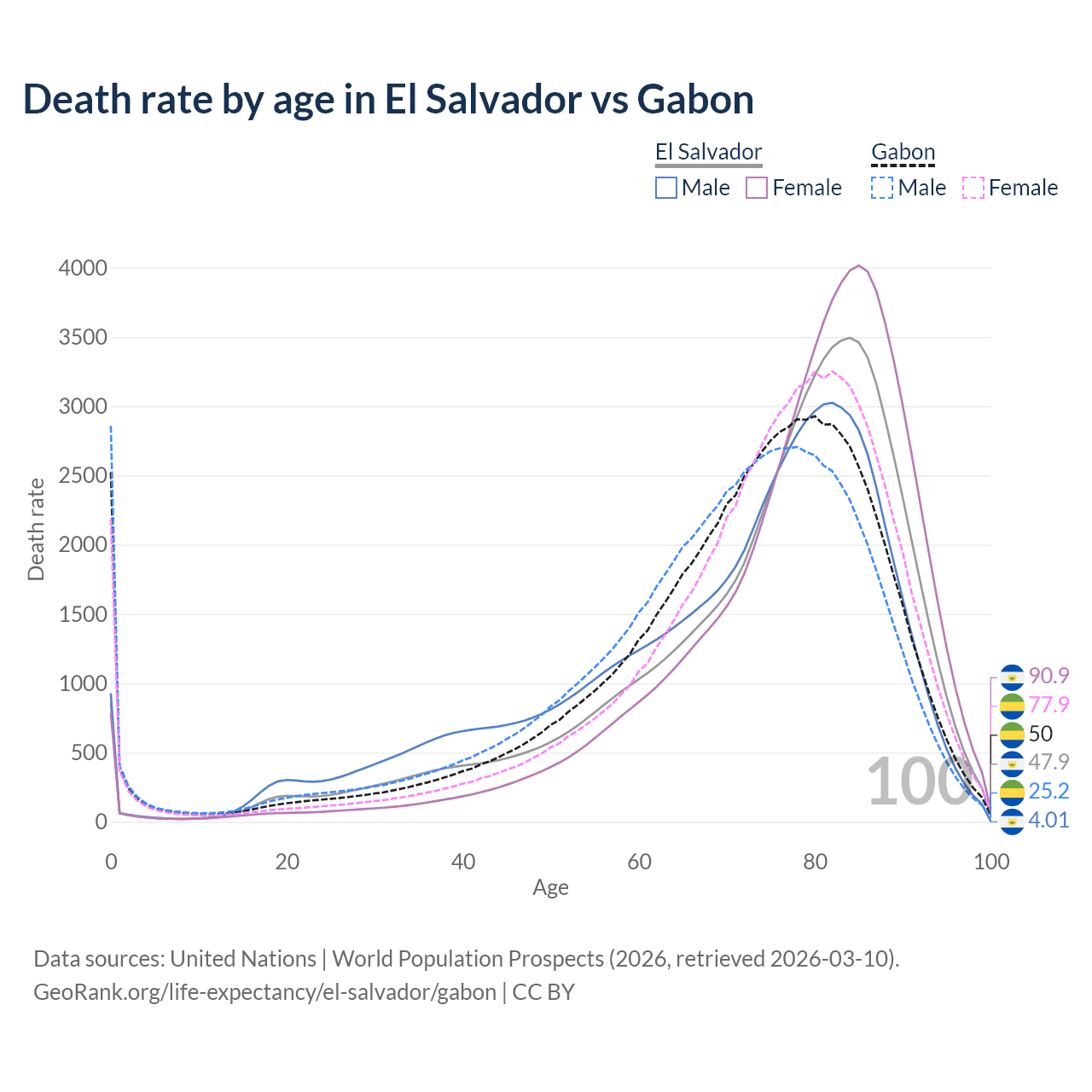 In El Salvador, the most common age of death is 84, compared to 80 in Gabon. The median age of death is 78.1 in El Salvador and 73.9 in Gabon, meaning only half of each cohort is expected to live past that age.
