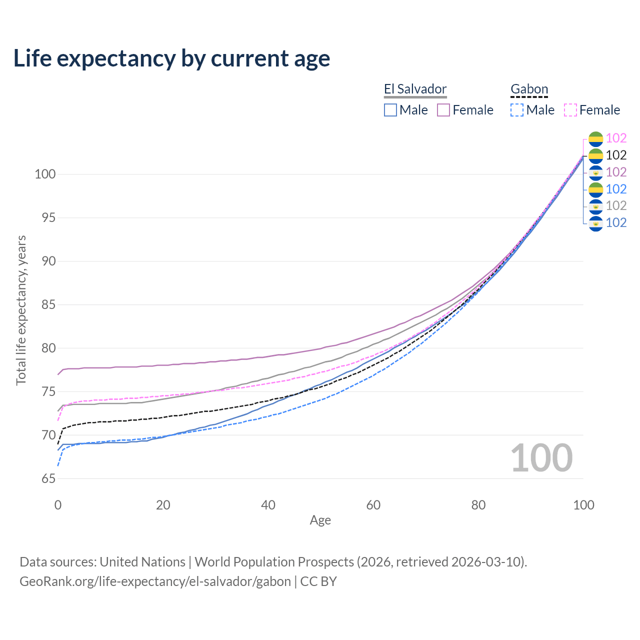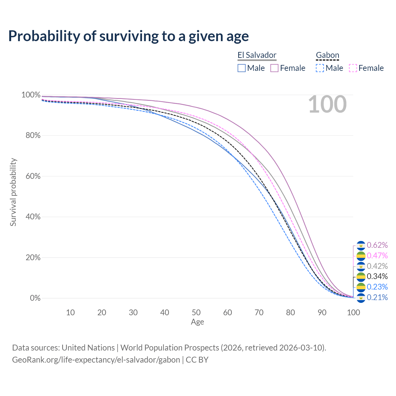 This life expectancy calculator shows the odds of living to 100, 95, 90, and below based on current age for both males and females in El Salvador and Gabon, along with mean and median age of death. The calculations are based on the 2026 life tables (actuarial tables) from the UN World Population Prospects.