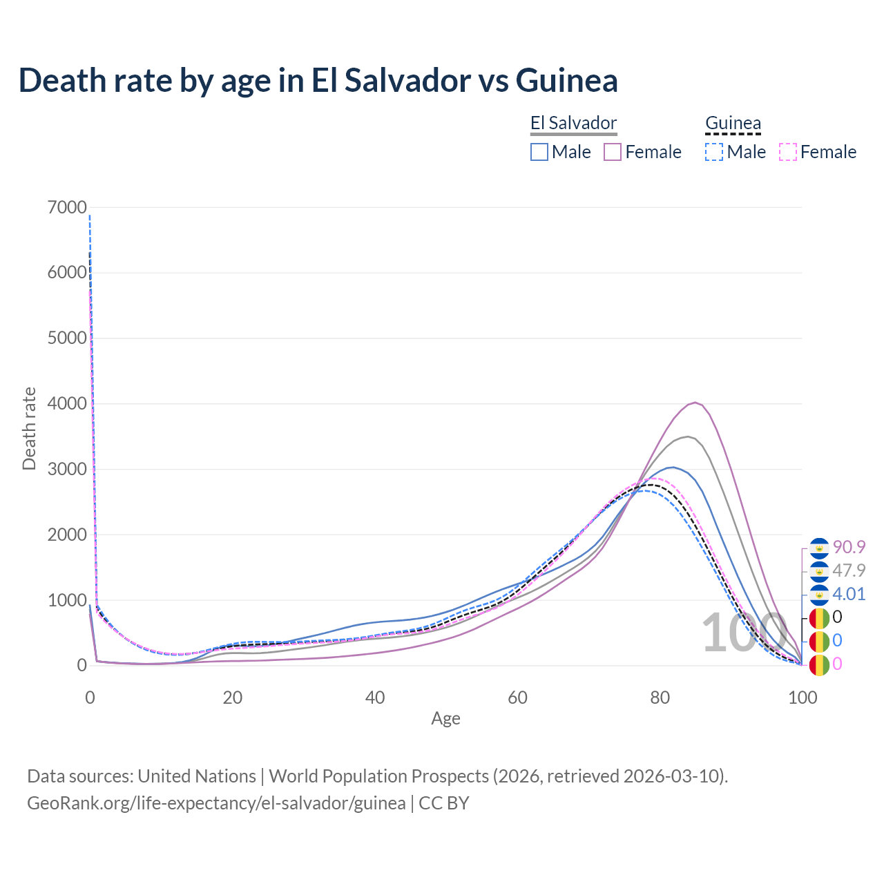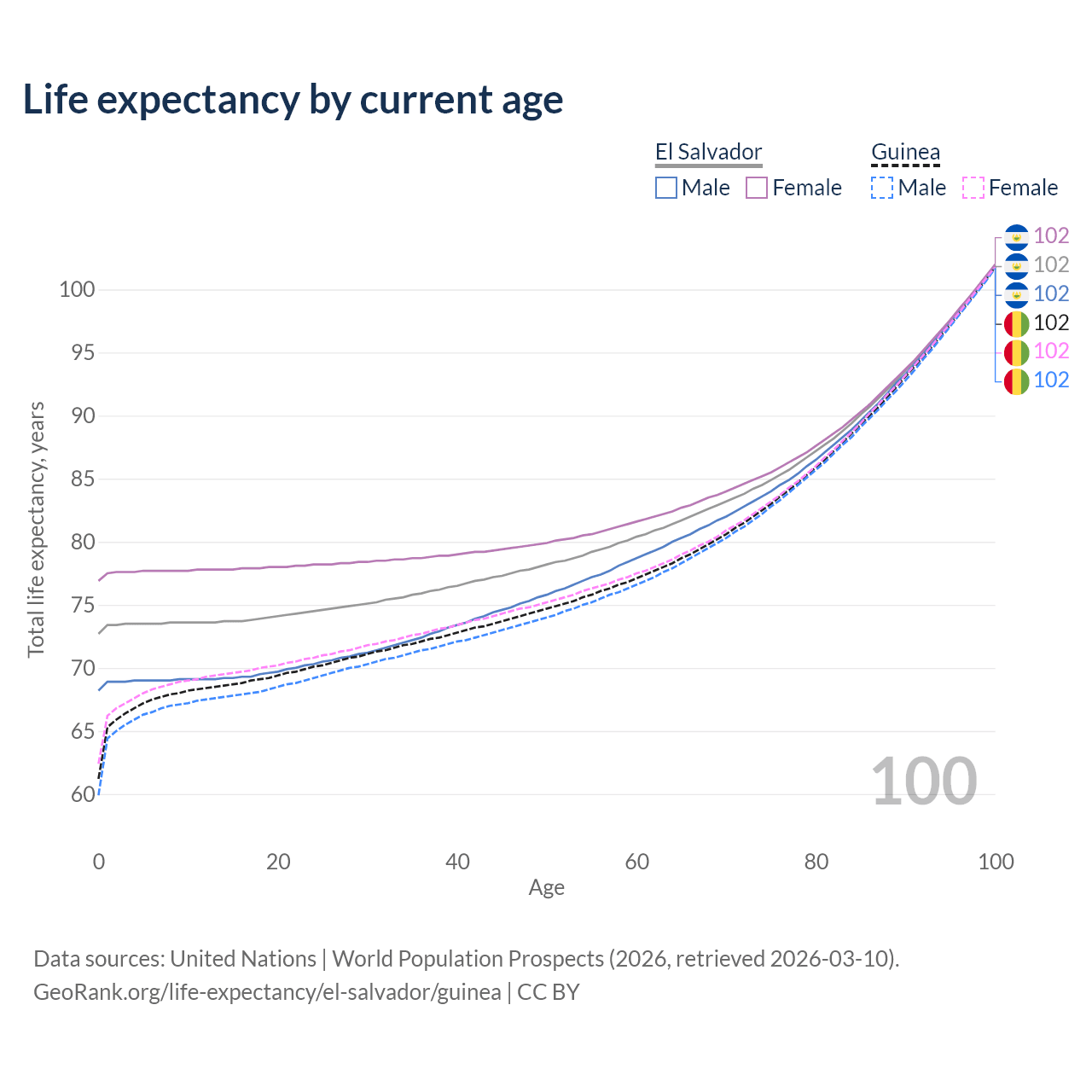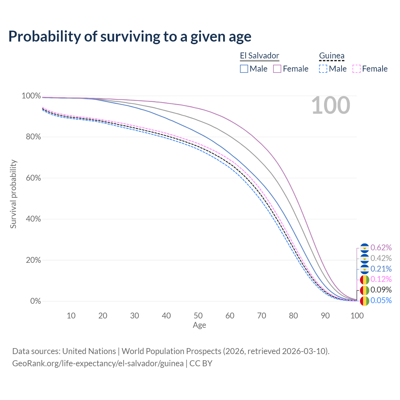 This life expectancy calculator shows the odds of living to 100, 95, 90, and below based on current age for both males and females in El Salvador and Guinea, along with mean and median age of death. The calculations are based on the 2026 life tables (actuarial tables) from the UN World Population Prospects.