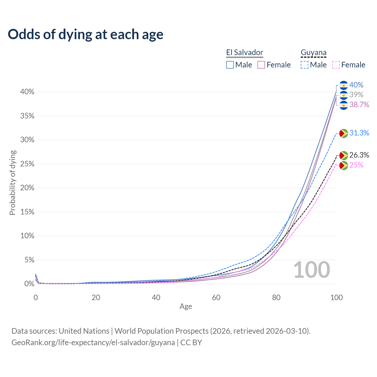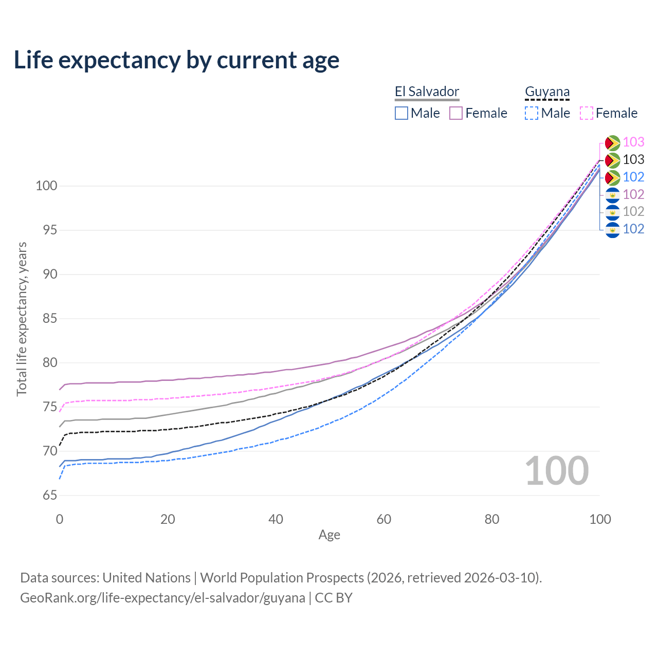This life expectancy calculator shows the odds of living to 100, 95, 90, and below based on current age for both males and females in El Salvador and Guyana, along with mean and median age of death. The calculations are based on the 2026 life tables (actuarial tables) from the UN World Population Prospects.