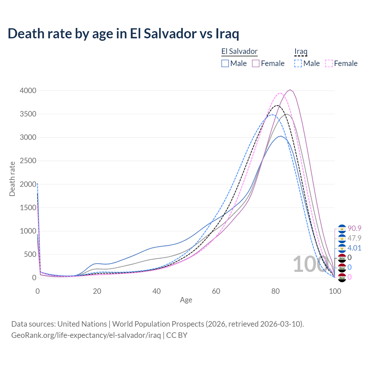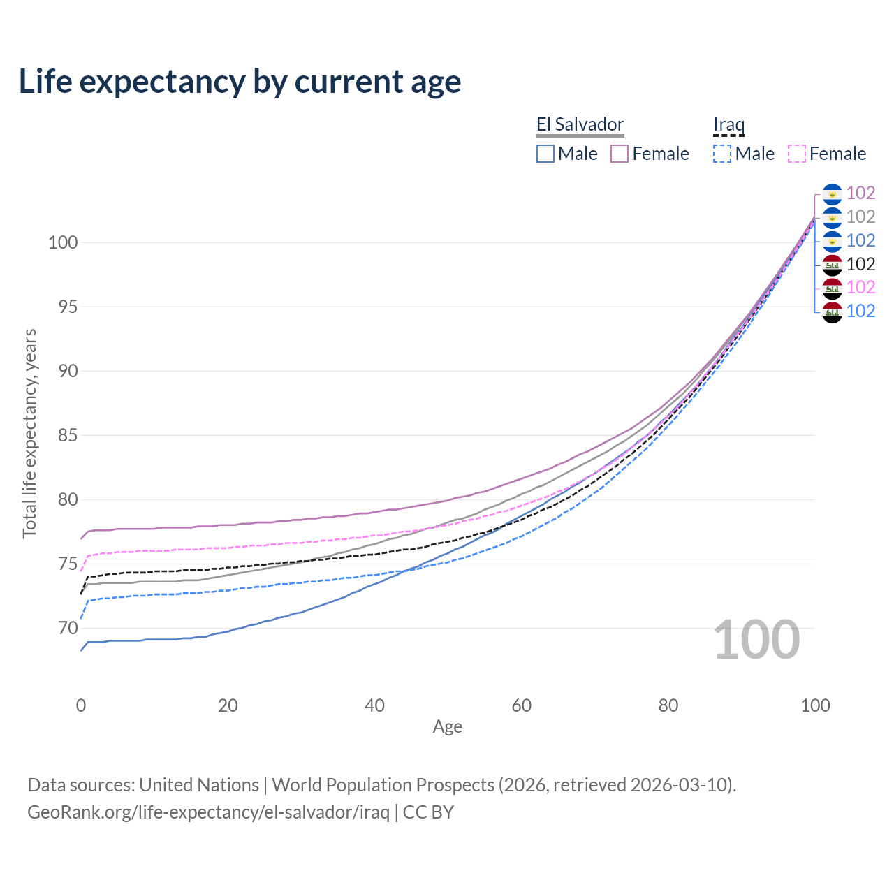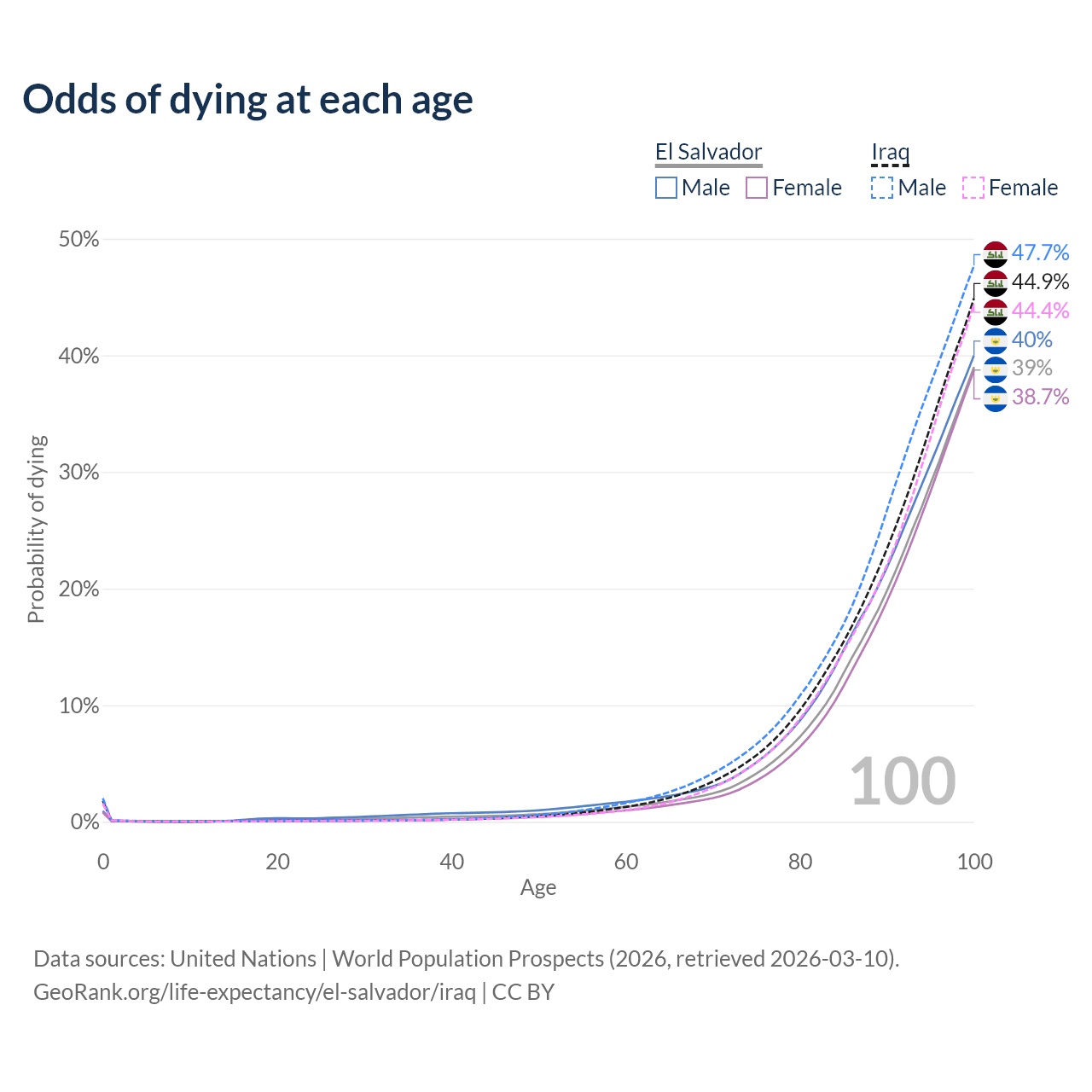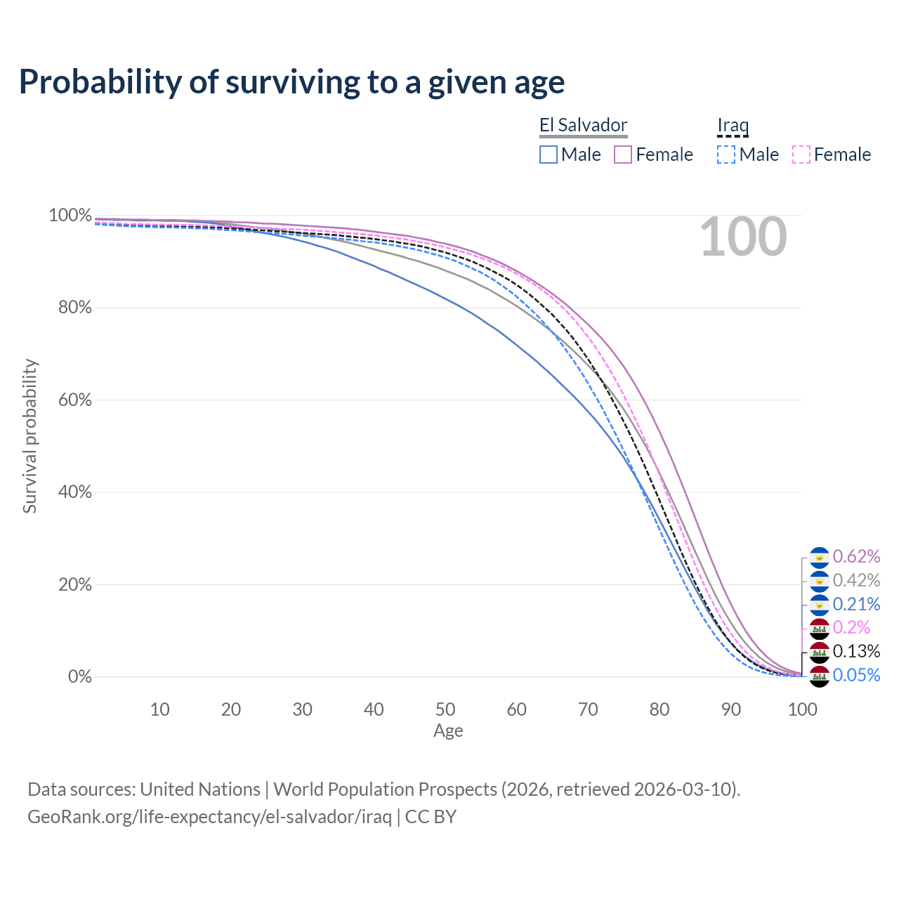 This life expectancy calculator shows the odds of living to 100, 95, 90, and below based on current age for both males and females in El Salvador and Iraq, along with mean and median age of death. The calculations are based on the 2026 life tables (actuarial tables) from the UN World Population Prospects.