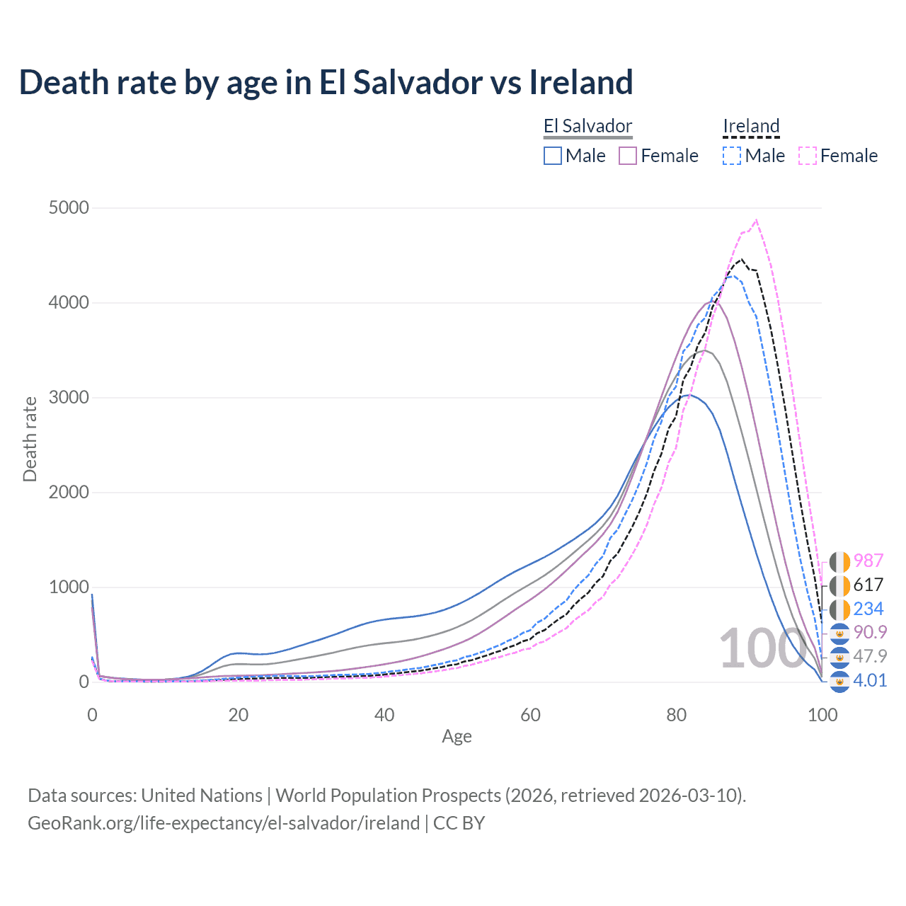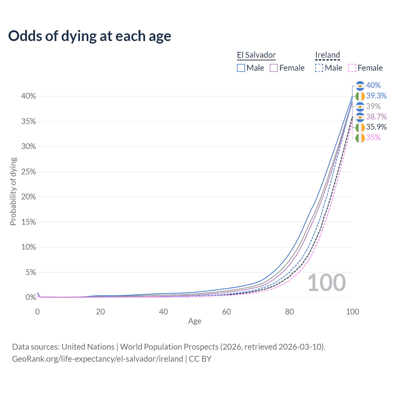 This life expectancy calculator shows the odds of living to 100, 95, 90, and below based on current age for both males and females in El Salvador and Ireland, along with mean and median age of death. The calculations are based on the 2026 life tables (actuarial tables) from the UN World Population Prospects.