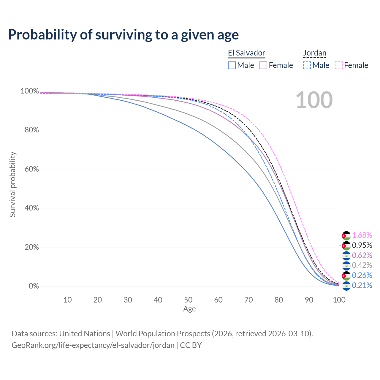 This life expectancy calculator shows the odds of living to 100, 95, 90, and below based on current age for both males and females in El Salvador and Jordan, along with mean and median age of death. The calculations are based on the 2026 life tables (actuarial tables) from the UN World Population Prospects.