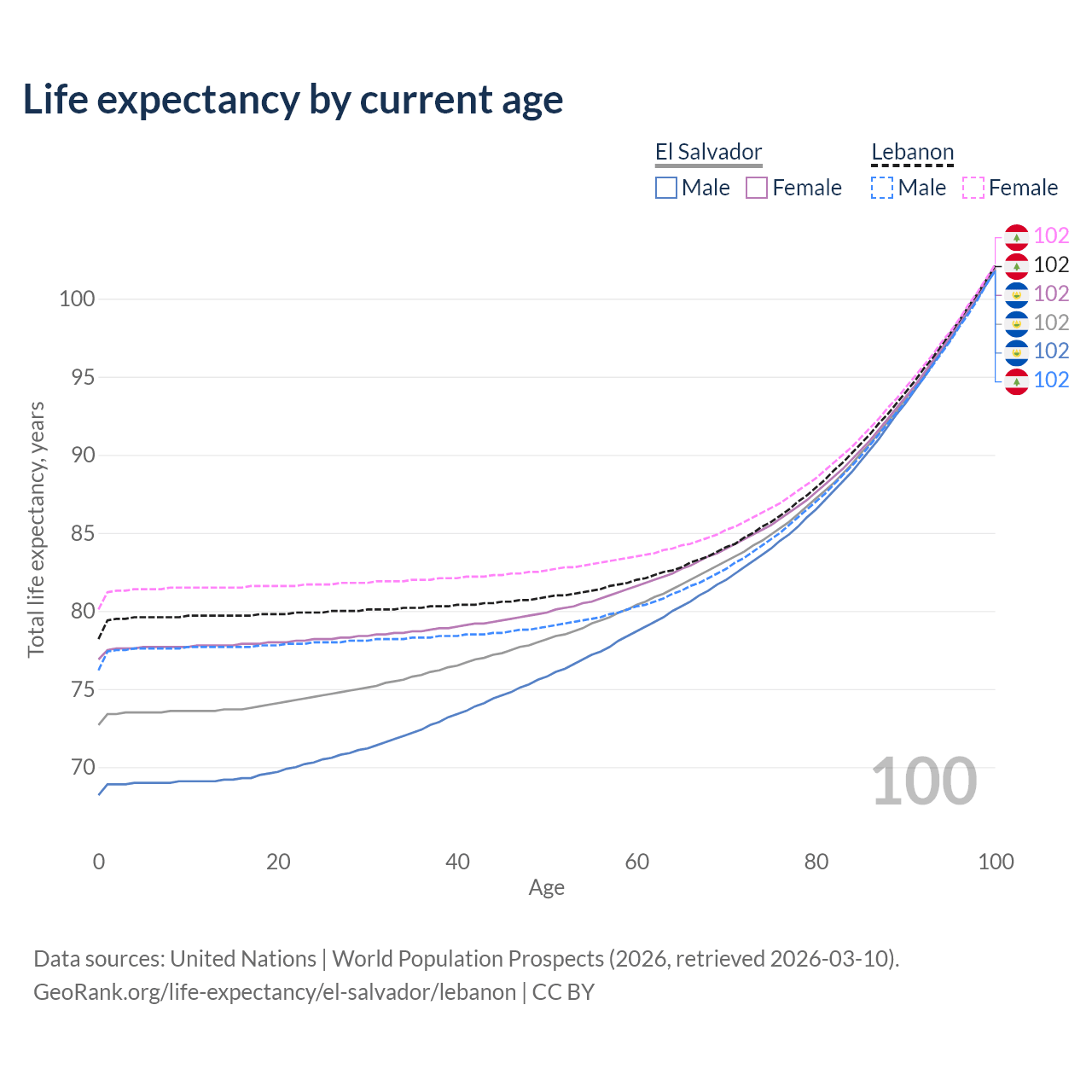 This life expectancy calculator shows the odds of living to 100, 95, 90, and below based on current age for both males and females in El Salvador and Lebanon, along with mean and median age of death. The calculations are based on the 2026 life tables (actuarial tables) from the UN World Population Prospects.