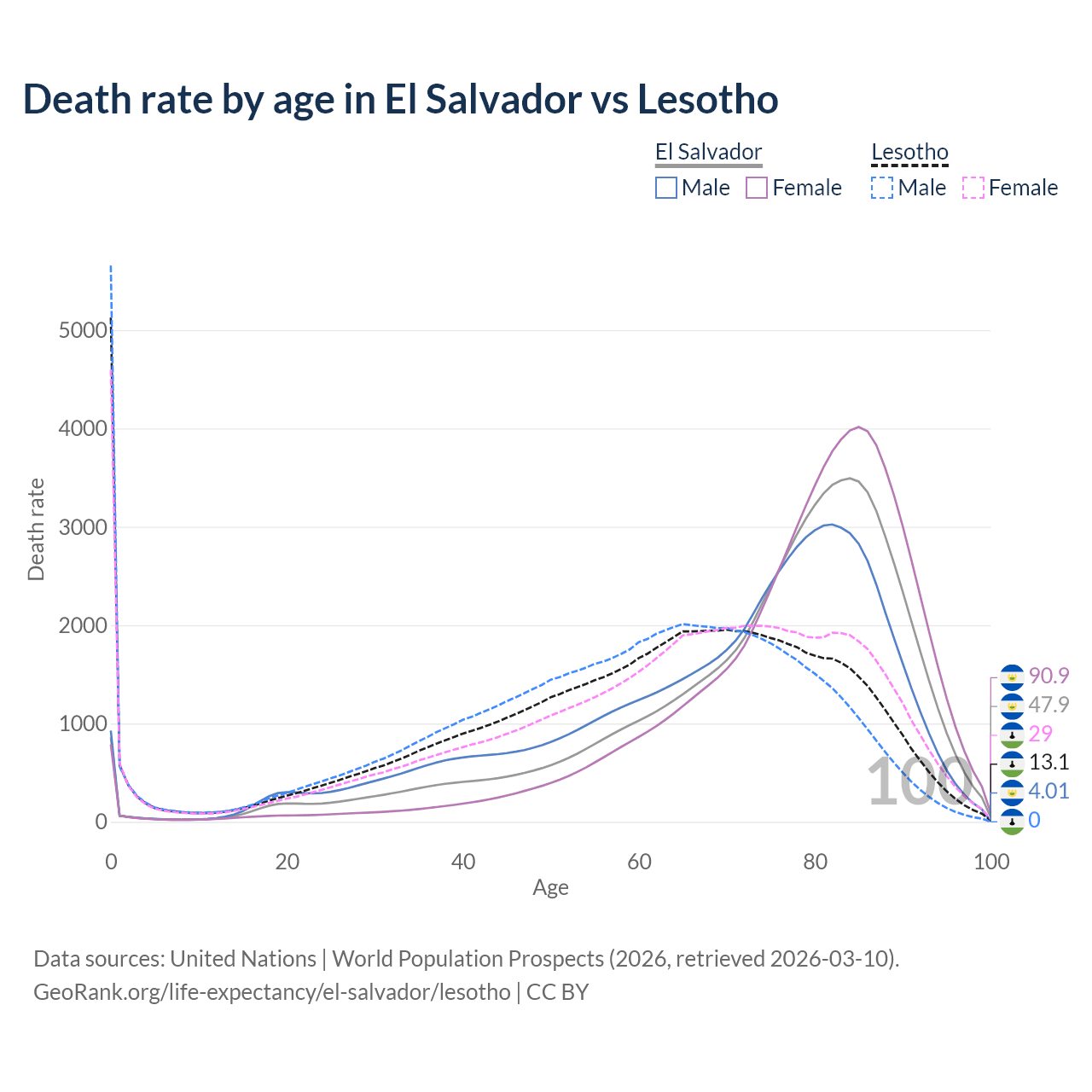 In El Salvador, the most common age of death is 84, compared to 0 in Lesotho. The median age of death is 78.1 in El Salvador and 63.4 in Lesotho, meaning only half of each cohort is expected to live past that age.