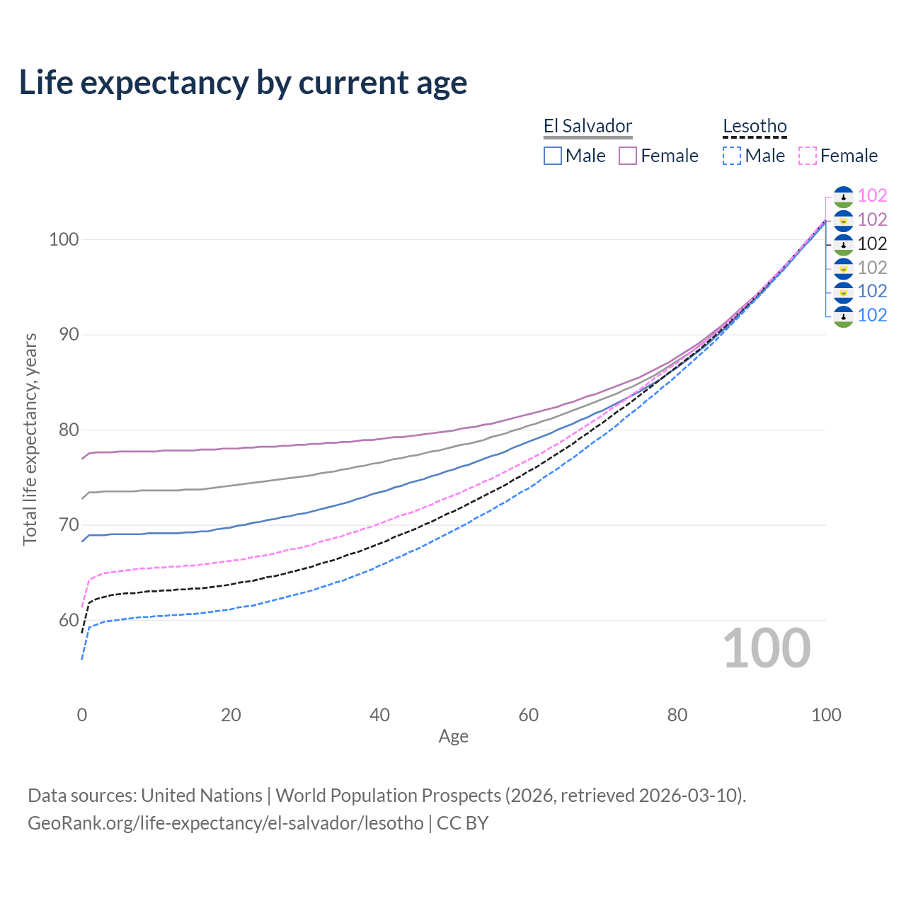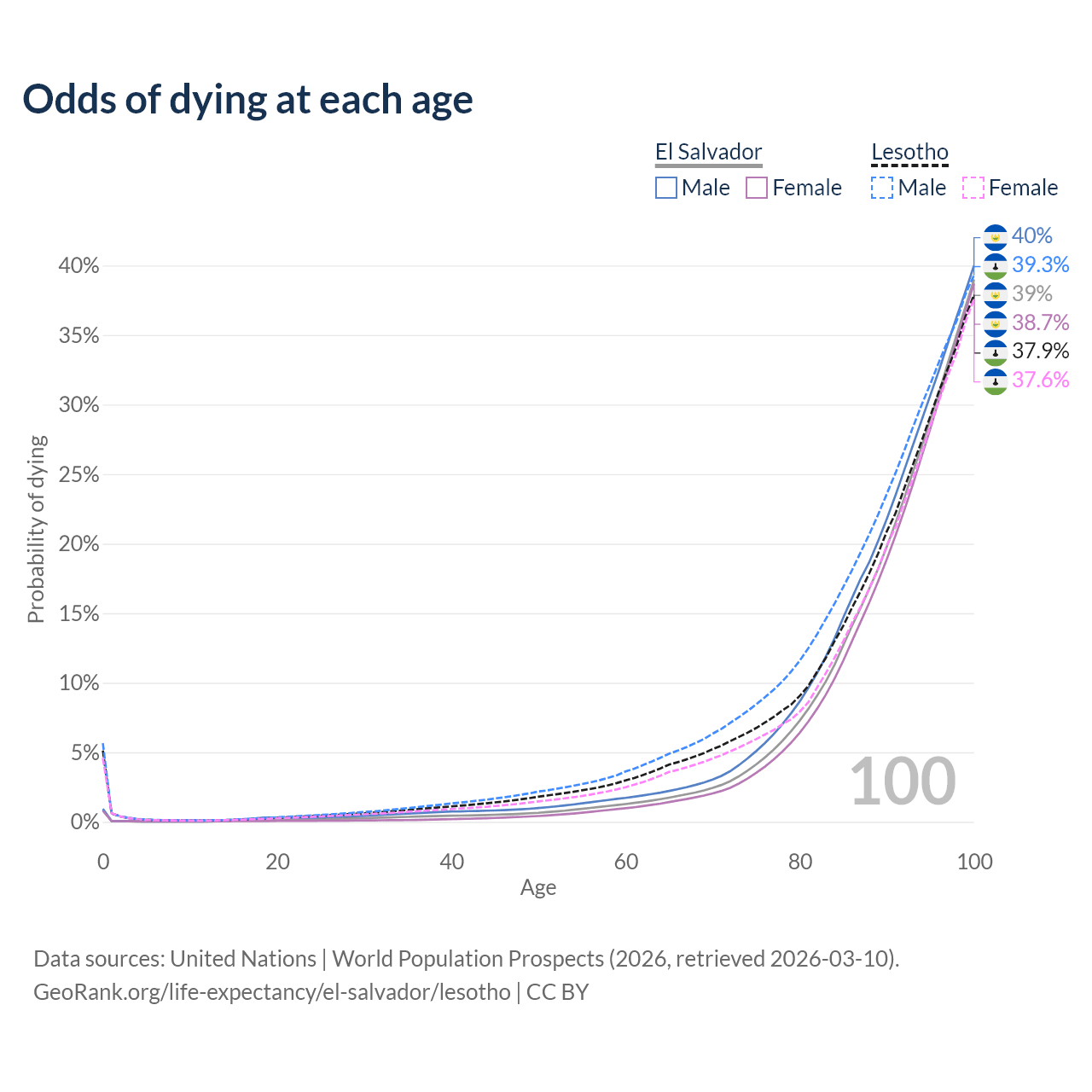 This life expectancy calculator shows the odds of living to 100, 95, 90, and below based on current age for both males and females in El Salvador and Lesotho, along with mean and median age of death. The calculations are based on the 2026 life tables (actuarial tables) from the UN World Population Prospects.